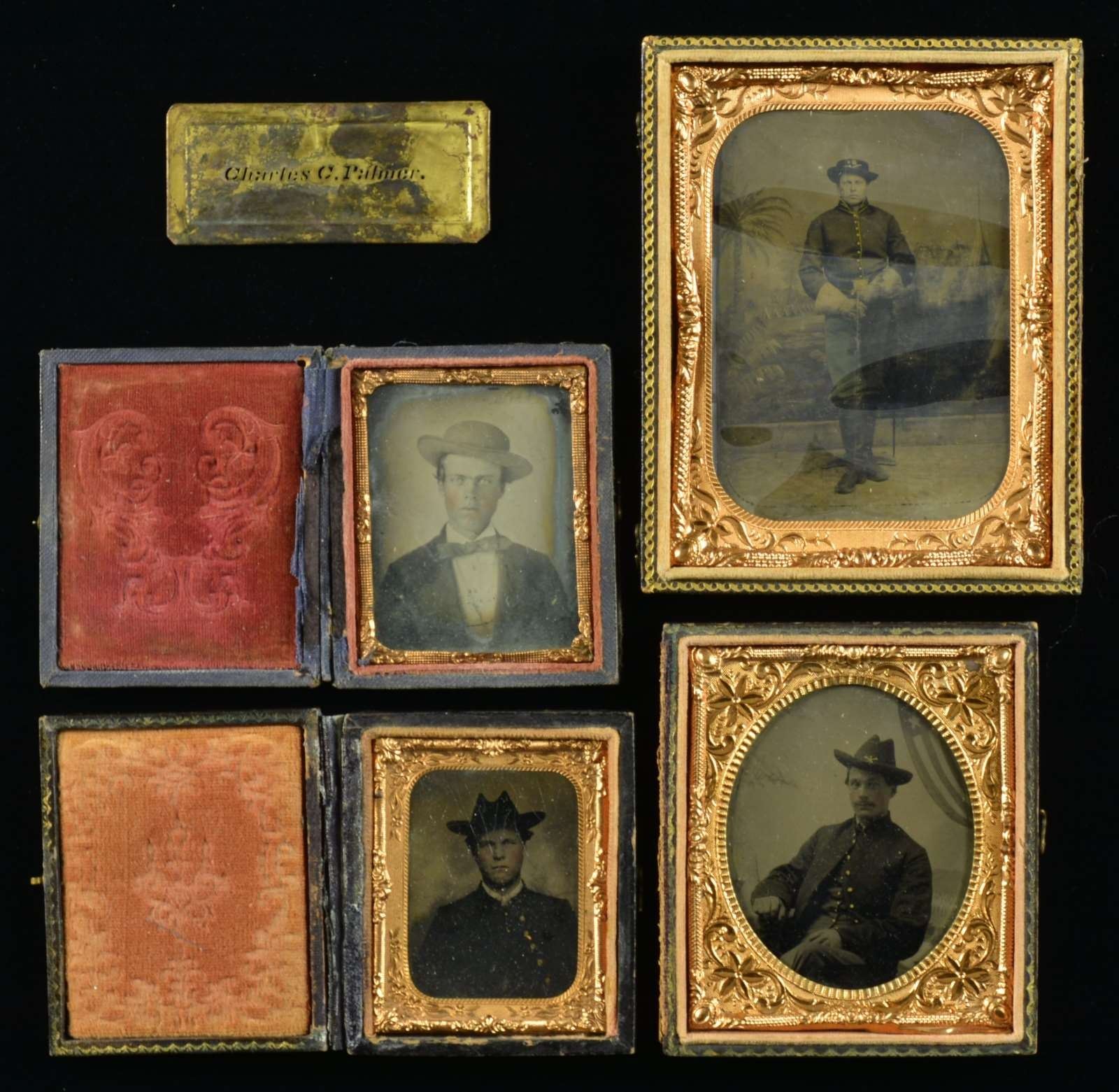 8. Two ninth plate tintypes of Charles C. Palmer (Exeter, Maine) and stencil, one image in uniform, the other civilian, Charles died as POW January 1865.