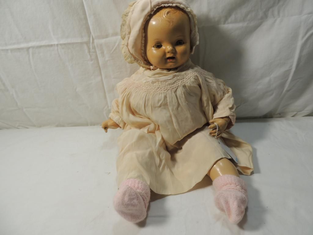 SLEEP EYES. OPEN SMILE. ANTIQUE DOLL GOOD CONDITION. RARE COLLECTIBLE. COMPOSITION DOLL. COLLECTORS DREAM. BEAUTIFUL DRESS. AS SHOWN. SEE PHOTO FOR MORE DETAILS.