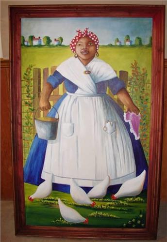 LARGE CONTEMPORARY BLACK AMERICANA PAINTING. Depicts an African-American female feeding chickens. 41.5" x 65.5" framed.