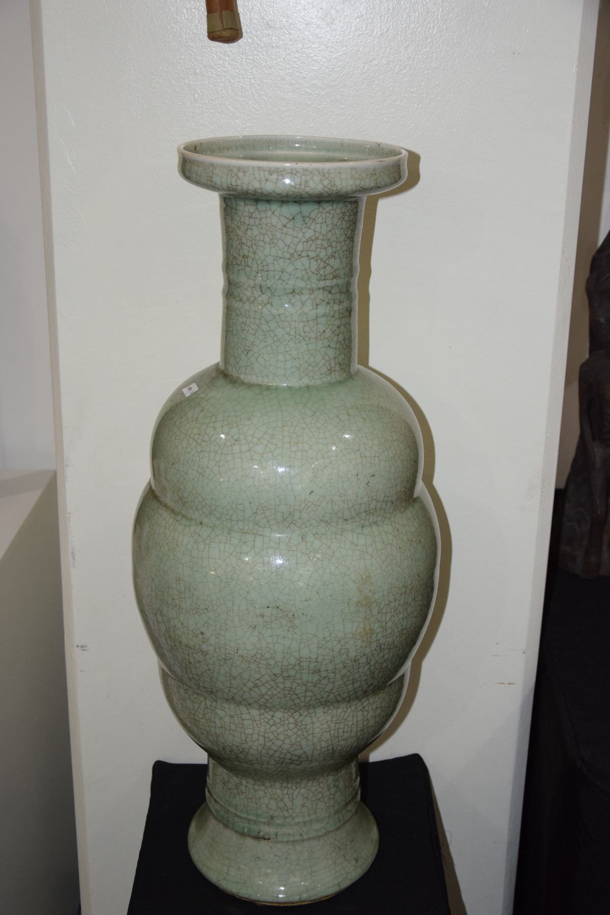 LARGE CRACKLE GLAZE CELEDON VASE (27 1/2" H)