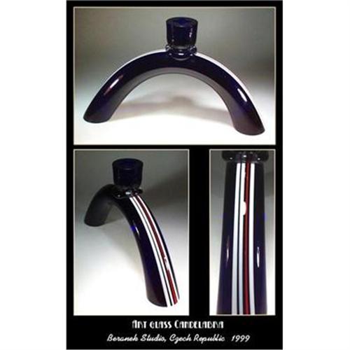 No other country in the world is more known for its Artistry in glass than Czechoslovakia. This hand blown arch shaped candlestick in cobalt blue with fused red and white lines is breathtaking. Excellent condition, no chips, cracks or repairs. Quite heavy piece ( almost 5 pounds) Dimension : 14" wide and 7-1/2" high. Made in 1997 by renowned Beranek Studio in Czech Republic, signed on the paper label. Great addition to your collection or to contemporary interior. Extremely difficult to capture the real beauty, which eye so easily perceives....