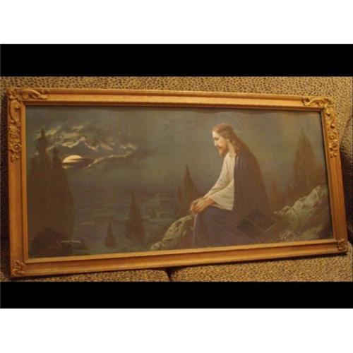 This carved 1920's frame with original print of Jesus on the mount is in its original state with no repairs or add ons. This is quite large ( 32" x 16 1/2") and is a solid wood gilded frame. The colors are rich and deep and not faded or light. They are reminiscent of the Maxfield Parish prints with deep dusky colors. The only thing missing is the back paper which was torn partly off. I have another Jesus on the Mount listed as well. BOth are from the 20's.