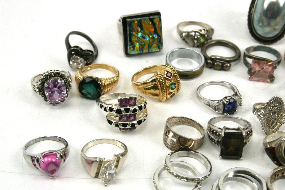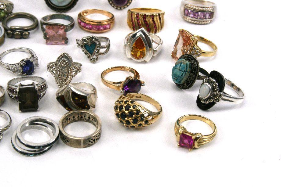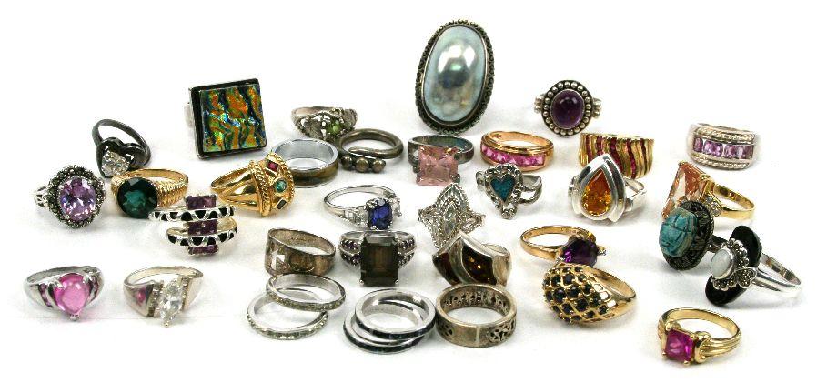 A collection of 34 sterling silver rings in various styles. . Size: 6-9 . Weight: 7.1 ozt . Condition: Very good