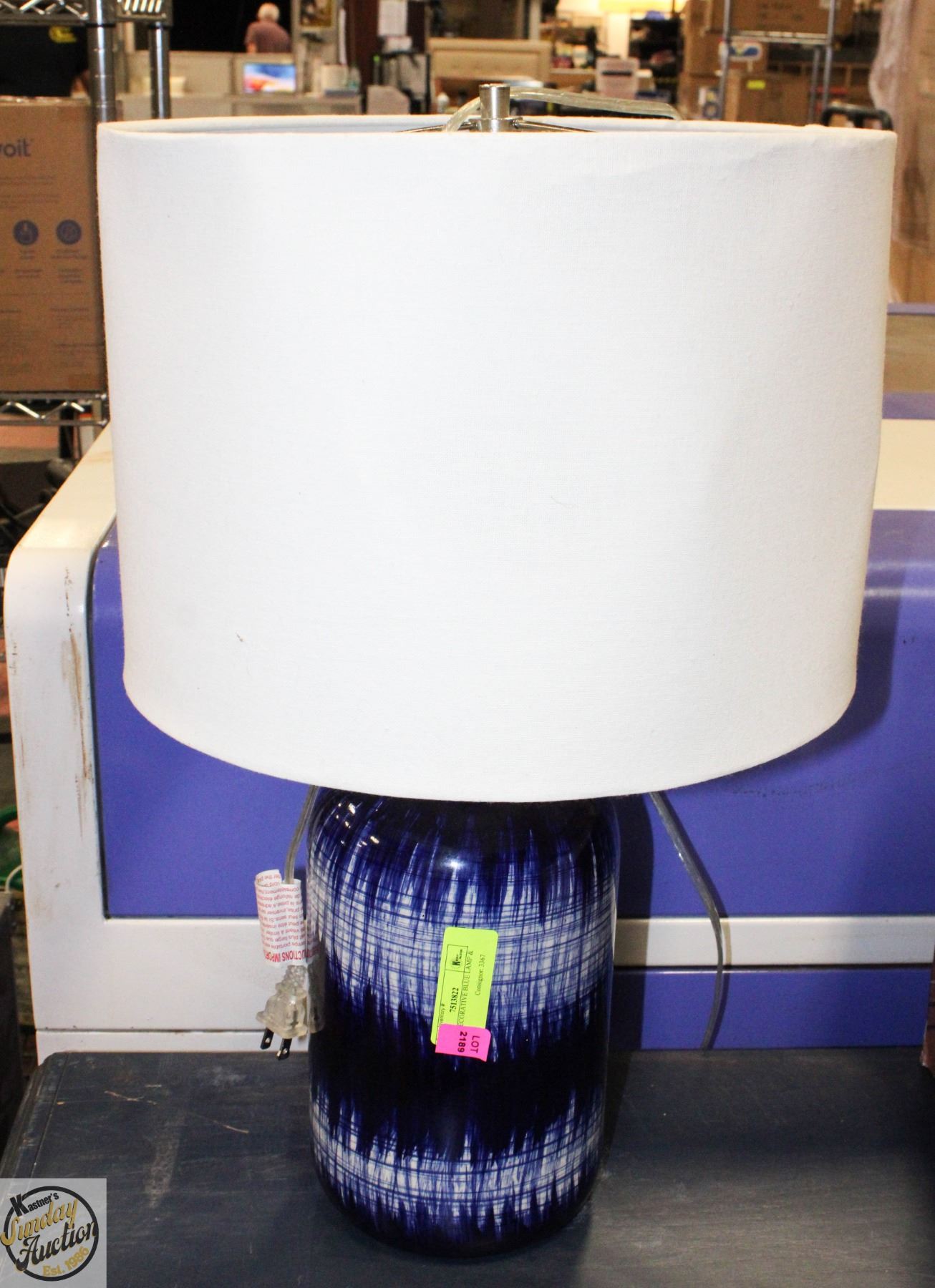 LARGE DECORATIVE BLUE LAMP & SHADE **ALL ITEMS MUST BE REMOVED BY 5PM SATURDAY, JUNE 14TH 2025. ALL REMAINING ITEMS WILL BE SUBJECT TO A $6.00 PER DAY STORAGE CHARGE. ANY ITEMS REMAINING AFTER MONDAY, JUNE 30TH, 2025 WILL BE CONSIDERED FORFEITED. NO REFUNDS WILL BE ISSUED FOR FORFEITED ITEMS. TO SCHEDULE A PICK UP APPOINTMENT CLICK HERE