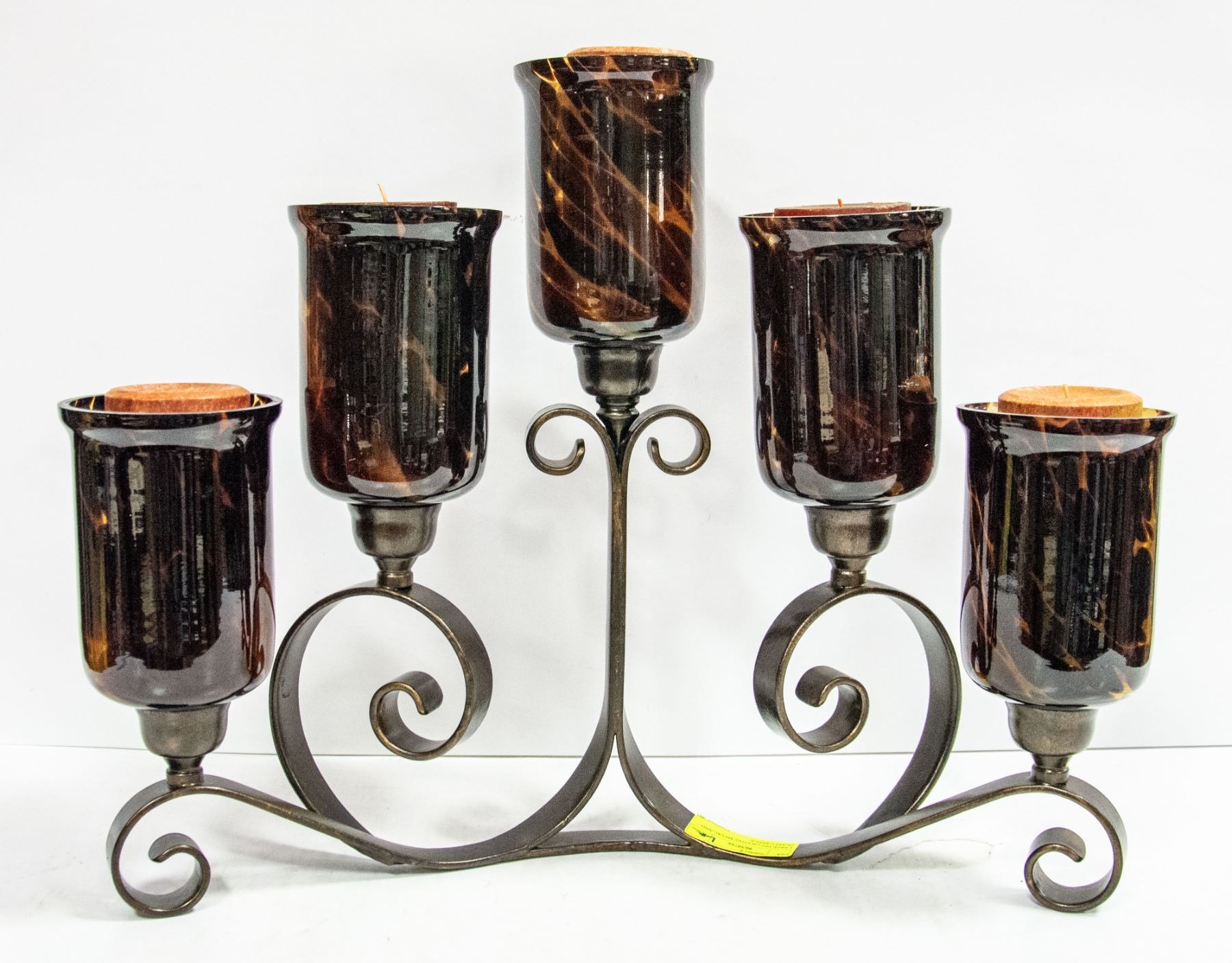 HOLDER - DARK BRONZE METAL WITH ESPRESSO TIGER STRIPED GLOBES (22"L X 7"W X 18"H) AND NEW CANDLES