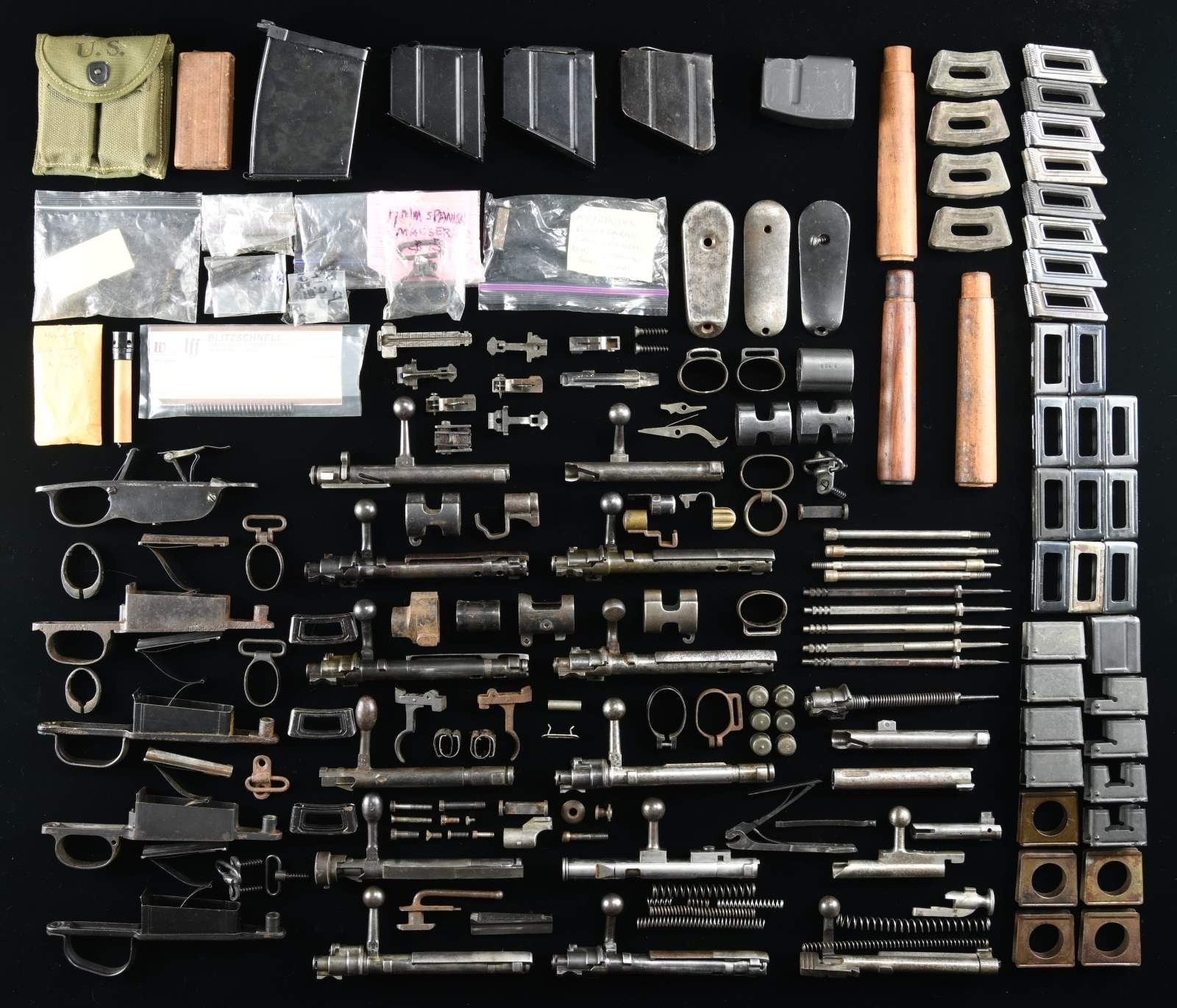 , COMPONENTS, MAGAZINES, & STRIPPER CLIPS. Notable components include 1 complete Gewehr 98 bolt assembly, 1 Gewehr 98 bolt assembly without the extractor, 3 Gewehr 98 firing pins, 1 Gewehr 98 trigger guard/floorplate/follower assembly, 2 hooked Gewehr 98 front barrel bands, 1 Gewehr 98 follower, 1 complete Kar98a bolt assembly, 1 Kar98a stacking rod, 4 complete K98 bolt assemblies, 1 clipped K98 firing pin with spring and shroud, 1 post-war Yugoslavian firing pin, 1 K98 firing pin, 2 flat K98 buttplates, 1 cupped K98 buttplate, 3 K98 front barrel bands, 3 K98 rear barrel bands, 1 K98 trigger guard/floorplate/follow assembly, 2 post-war Czech K98 trigger guard assemblies, 1 K98 handguard, 2 Mauser pattern handguards, springs for G43/K43 recoil springs, 1 complete and matching Type 99 bolt assembly, 1 matching Type 99 bolt body and firing pin, 1 Berthier bolt assembly, 1 Carcano bolt assembly, 1 dewatted SMLE bolt, 1 91/30 Mosin Nagant bolt body & cocking piece, 1 91/30 Mosin Nagant floorplate assembly, 1 Steyr M95 trigger guard assembly, as well as other small parts and components. Magazine/Stripper clips include: 2 No. 4 Mk I 10 round magazines, 1 SMLE 10 round magazine, 1 reproduction Gewehr 98 trench magazine, 1 Schmidt-Rubin K31 6 round magazine, 1 M1 Carbine 5 round magazine, 1 mummified M1 Carbine 15 round magazine, 1 2 cell M1 Carbine green canvas magazine pouch containing 2 15 round magazines, 4 M1 Garand 8 round enbloc clips, 2 M1 Garand 5 round enbloc clips, 2 M1 Garand 2 round enbloc clips, 3 Dutch Mannlicher clips, 10 Carcano clips, 5 Mauser Model 1888 enbloc clips, 8 Steyr M95 enbloc clips, and 4 Berthier 5 round enbloc clips. CONDITION: parts and components show varying degrees of wear and oxidation overall, with all appearing sturdy and serviceable. A very nice assortment of predominately foreign military rifle parts and components! (02-19822-1/MLW). $800-1,200.