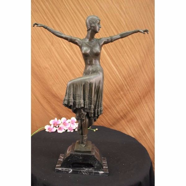 Marvelous flow in detail captured in Chiparus's form. Another stunning piece to collect decorate, and behold in your abode or office. Only the highest quality in patina is used to last generations. The brown flesh tones are actually the amazing applications of a patina blend over bronze. This bronze stands 27 1/2" Tall 19 1/2" Wide and 9" Deep with an original Chiparus signature at the base of the bronze. Casted in Europe using the lost wax method. Notice the authenticity of this recast of the original sculpture by examining the head torso and hand positions. Poor reproductions do not use the original mold and create their sculptures based on artist's renditions. Notice the magnificent application of this patina blend which will was fused into the bronze to last for generations. Condition: This sculpture is in a very good condition. Bronze Dimensions with Marble Base:Height 27 1/2" x Width 19 1/2" Marble Dimensions: 9 1/2" x 5 1/2" . Height without base: 23" Weight : 40 LBS Inventory; 14150B17141