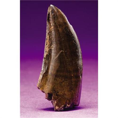 <B>LARGE DINOSAUR TOOTH</B></I><BR> <I>Albertasaurus libratus <BR>Cretaceous<BR>Two Medecine Formation, near Browning, Montana</B></I><BR>This large Tyrannosaurid tooth displays deep mahogany-colored enamel with good serrations. It measures 2¼ inches over the curve, and gives an idea of the fearsome sight this carnivorous theropod would have presented, with a mouth full of around 59 others equally sharp. It was a smaller creature than others of the Tyrannosauridae; the larger ones tended to have fewer teeth. The first remains of this species were found in Alberta, Canada, and named thereafter in 1905 by long-time president of the New York Zoological Society, Henry Fairfield Osborn.<BR><BR><b>Shipping:</b> Requires 3rd Party Shipping (<a target="_blank" href="http://www.heritageauctions.com/common/shipping.php">view shipping information</a>)
