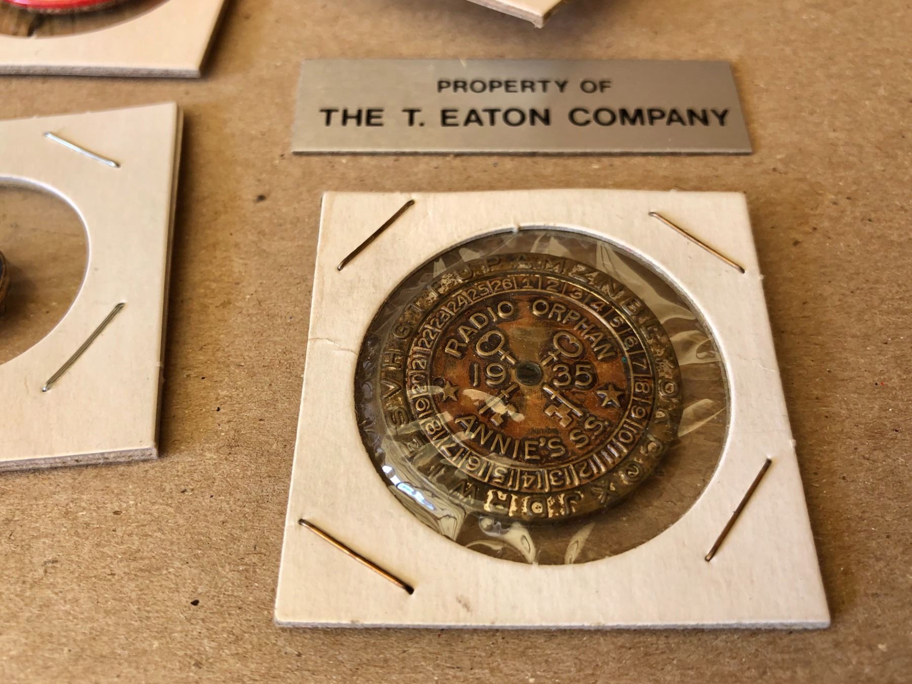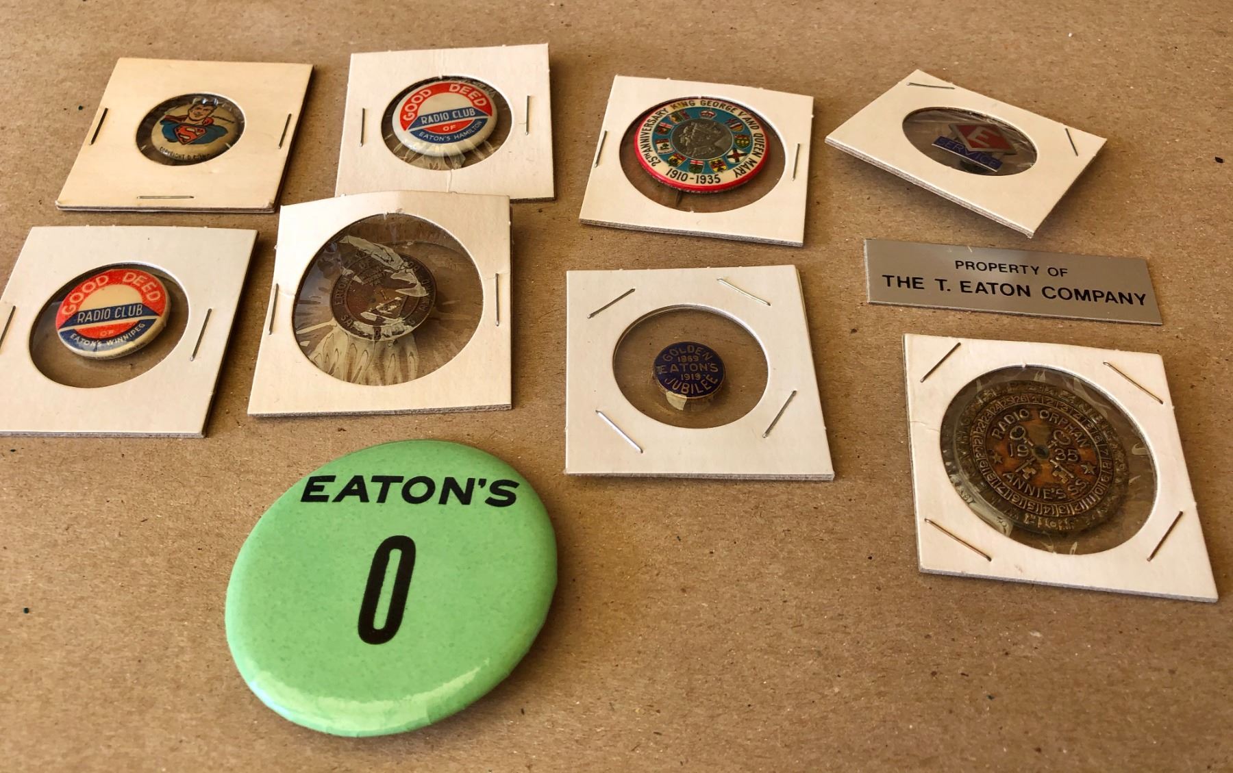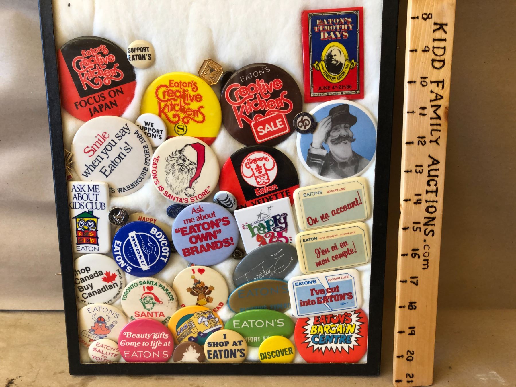 LARGE DISPLAY CASE OF EATON'S MEMORABILIA / BUTTONS