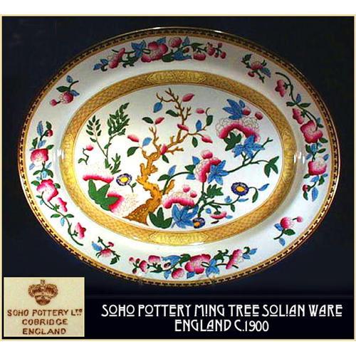 Beautiful, hand decorated English "Ming Tree" oval serving platter. Large size 16 x 13". Brown mark : Solian Ware, Soho Pottery, Cobridge, ENGLAND, circa 1900-20. Mint condition, no chips, cracks or repairs. Please note that in some cases photo sizes are automatically reduced, so if you want to see full size or detailed pictures, please email us.
