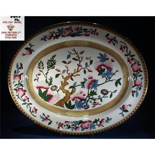 Please note that for Ebay Live Auction only bids at or above $170 will be successful and meet our reserve. Beautiful, hand decorated English "Ming Tree" oval serving platter. Large size 16 x 13". Brown mark : Solian Ware, Soho Pottery, Cobridge, ENGLAND, circa 1900-20. Mint condition, no chips, cracks or repairs. Please note that in some cases photo sizes are automaticaly reduced, so if you want to see full size or detailed pictures, please email us ()