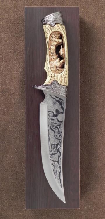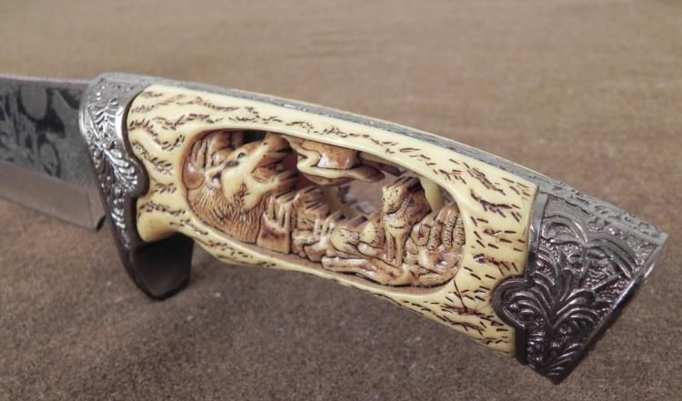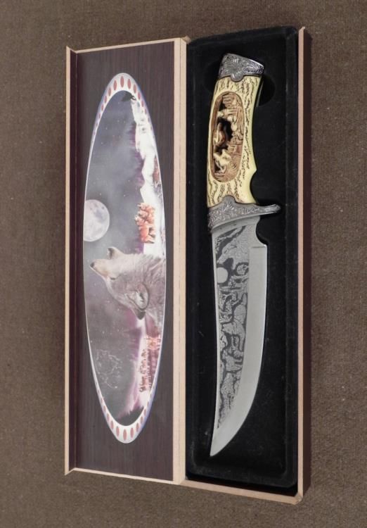 LARGE ETCHED BLADE HUNTING KNIFE-CUT OUT HOWLING WOLF GRIP-DECORATIVE POMMEL-W/CASE APPROX 11" KNIFE WITH WOLVES, FULL MOON AND MOUNTAINS MOTIF IN ETCHED BLADE--CROSS CHECK EDGE-CHINESE CRAFTED-GRIP IS CUT OUT WITH SAME SCENE AS BLADE-COMES WITH CASE-1 E