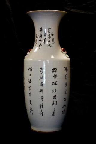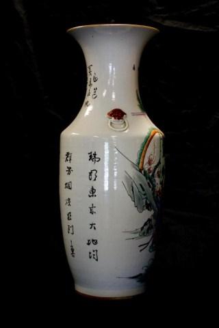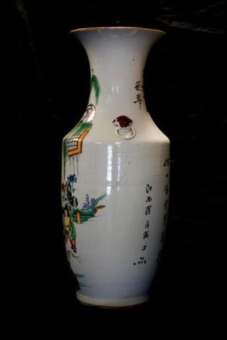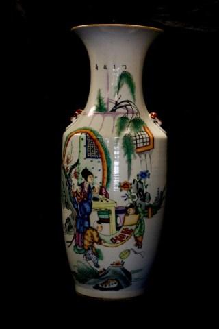 Beautifully and vibrantly depicts a woman with children. Has calligraphy to back. Has figural foo dog head handles. Circa 1900. Holds the quality of the Yi Xing Long factory. Has impressed wax marks to bottom (see photo). Measures 23" height.