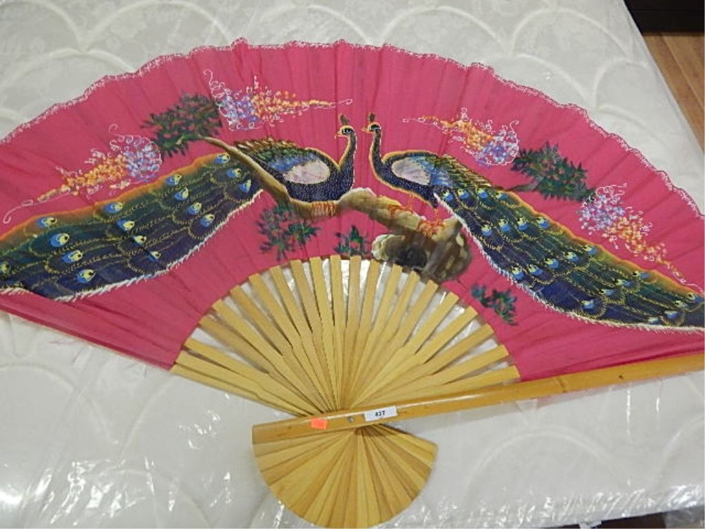 LARGE FAN - ORIENTAL HAND PAINTED - PEACOCKS ~3' L