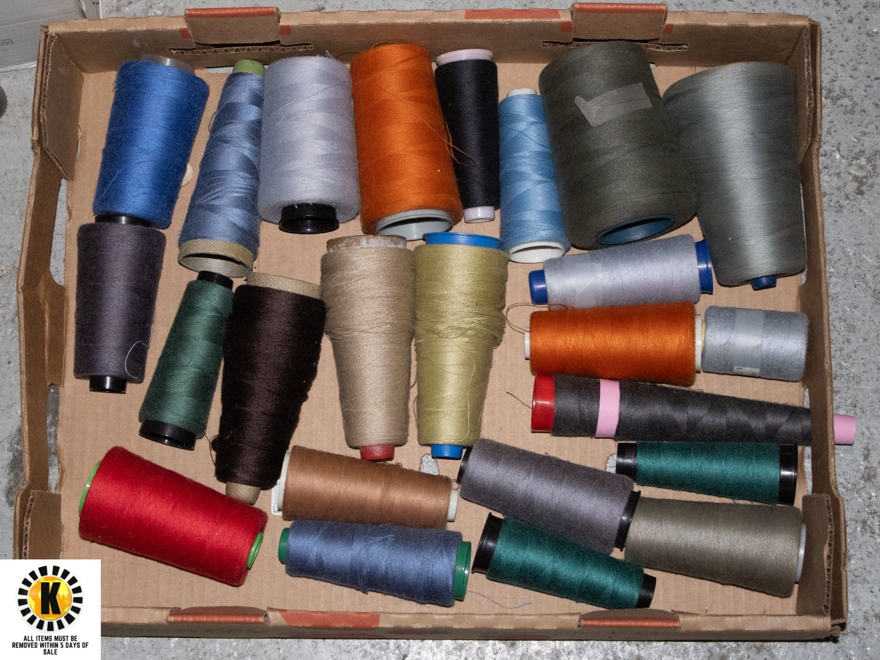 LARGE FLAT FULL OF LARGE SPOOLS OF THREAD