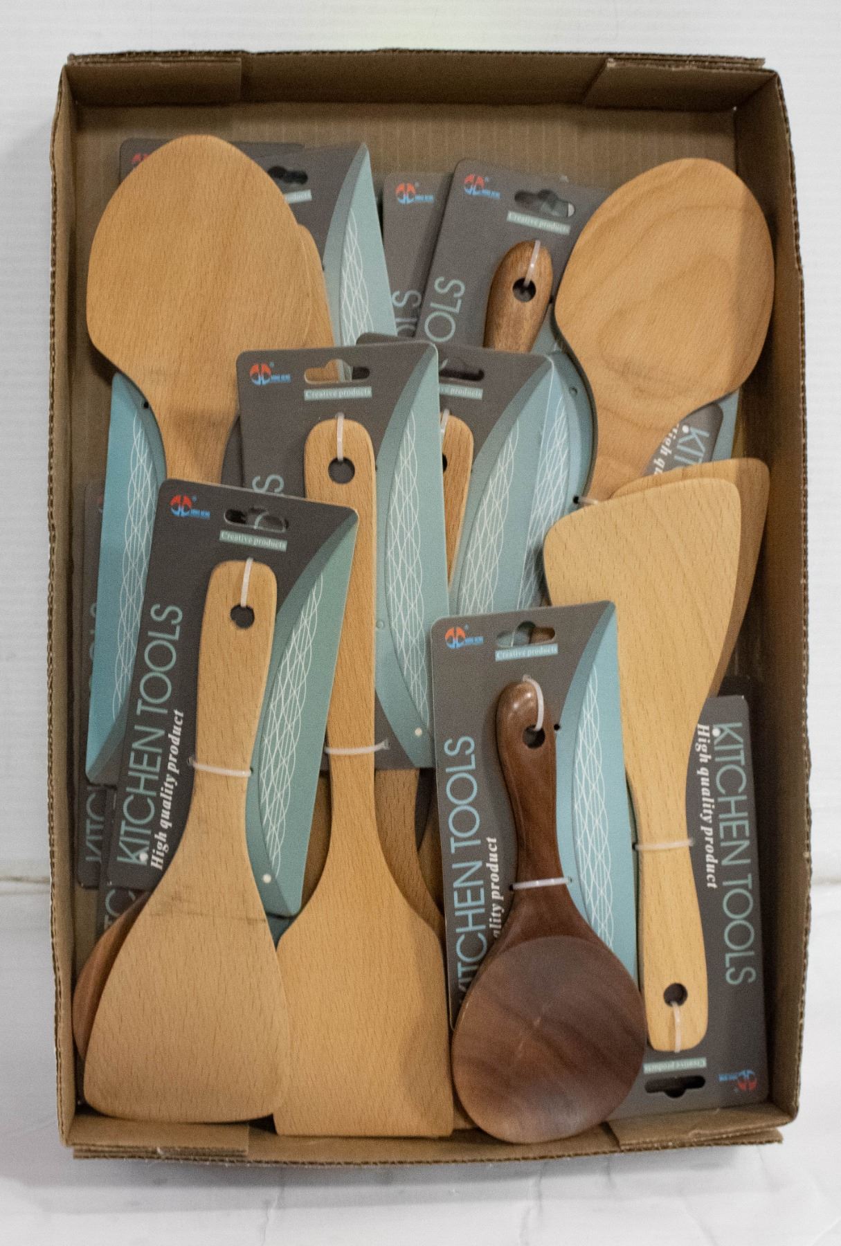 LARGE FLAT OF ASSORTED NEW WOODEN UTENSILS