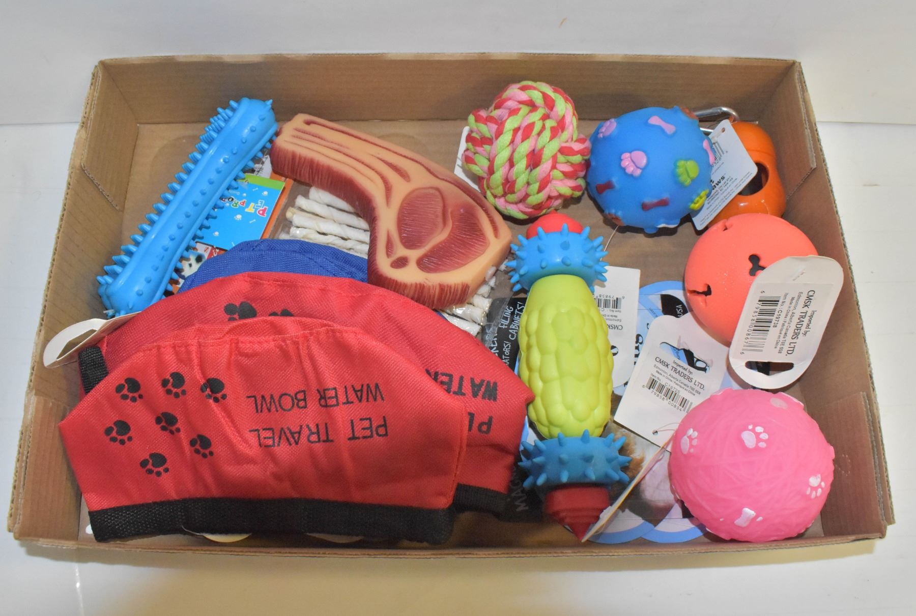 LARGE FLAT OF DOGGY TOYS & WATER BOWLS