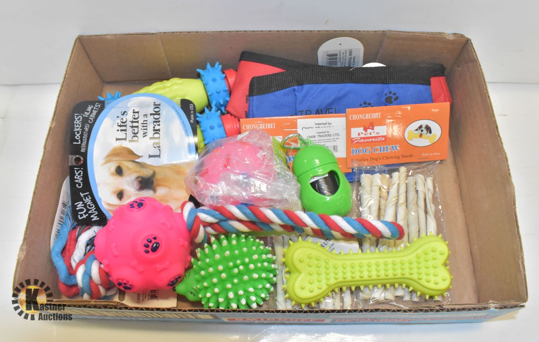LARGE FLAT OF DOGGY TOYS & WATER BOWLS