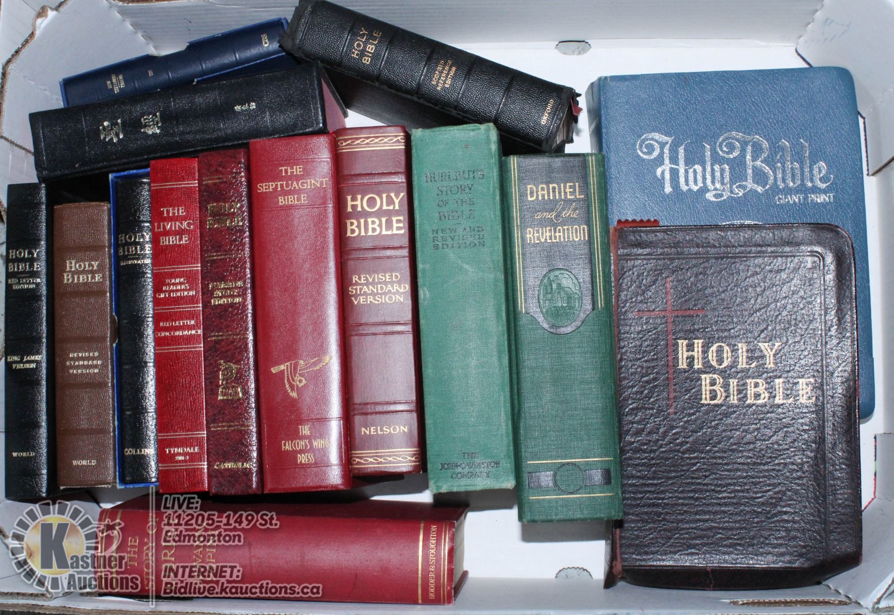 LARGE FLAT OF HARDCOVER BIBLES ALL DIFFERENT.