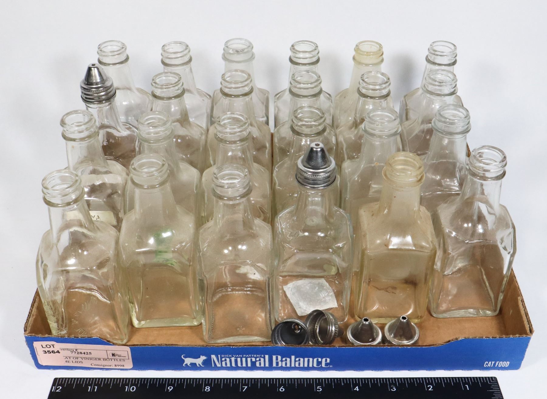 LARGE FLAT OF VINEGAR BOTTLES WITH SOME LIDS