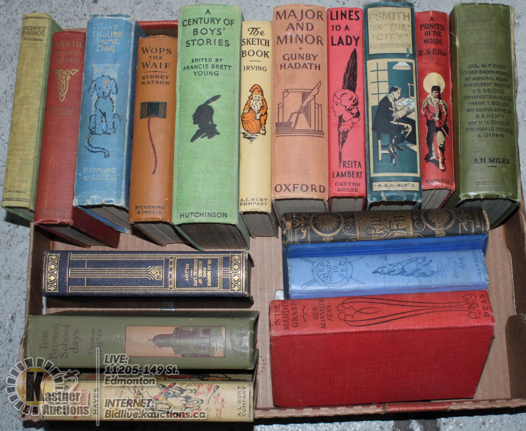 LARGE FLAT OF VINTAGE HARDCOVER BOOKS.