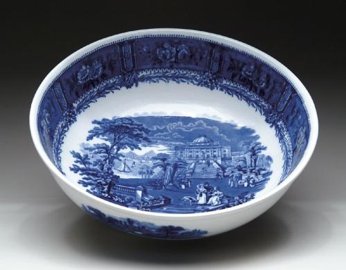 LARGE FLOW BLUE BOWL. Marked on the underside, ""CAULDON, ENGLAND"". Design depicts large stone palace-type structure beside the bay with people and animals in the foreground. SIZE: 15in. dia x 5-1/2in. h. CONDITION: Very good to excellent. 9-26394