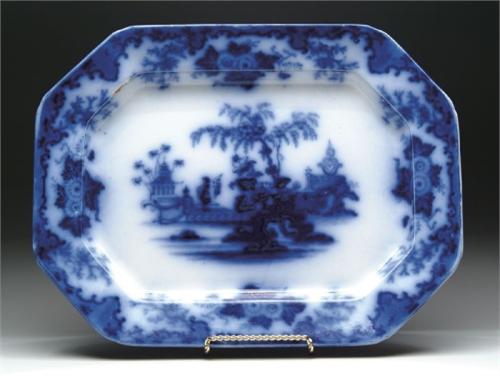 LARGE FLOW BLUE PLATTER IN THE ""SCINDE"" PATTERN. Impressed mark ""Oriental Stone"". SIZE: 20-1/2in. x 15-3/4in.. CONDITION: Some roughness to inside of rim, light knife marks. 9-25797