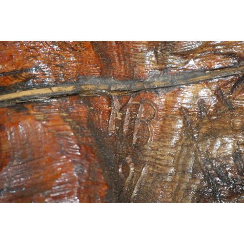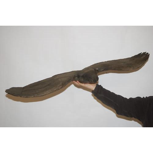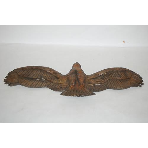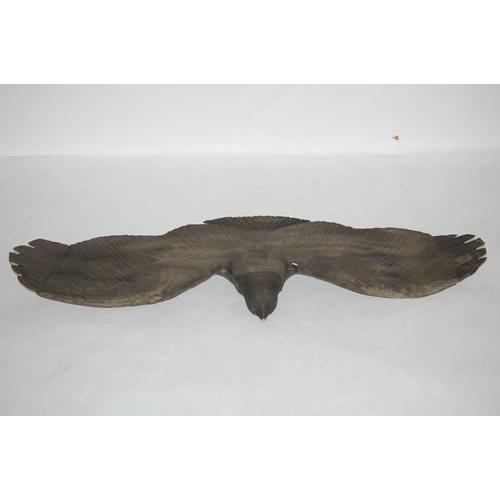 LARGE FOLK ART CARVED WOODEN EAGLE - 20TH CENT. PINE PRIMITIVE CARVED EAGLE IN FLIGHT SCULPTURE-SIGNED M.B. 91 UNDER LEFT WING (APPROX. 20" L X 52" W) - LOSSES TO WING TIPS, BEAK, ETC. WEAR, CRACKS, REPAIRS, IMPERFECTIONS