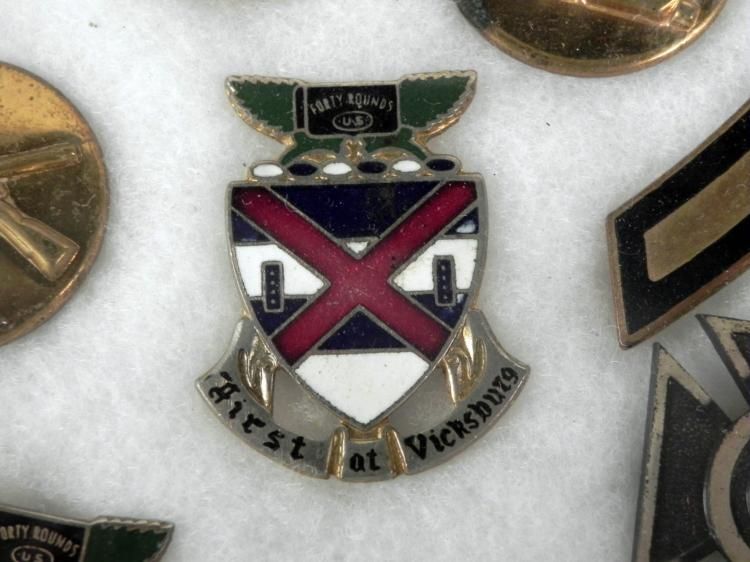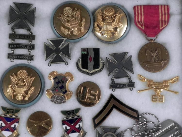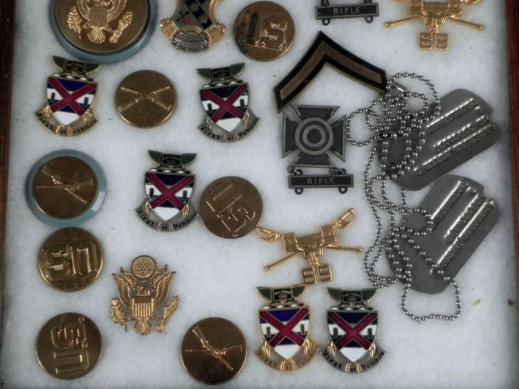 OFFERED HERE IS A LARGE FRAMED COLLECTION OF U.S. MILITARIA, FROM WWII THRU VIETNAM. THIS 9X11" FRAMED COLLECTION OF U.S. MILITARY ORIGINAL ITEMS INCLUDES EXPERT QUALIFICATION BADGES WITH BARS ATTACHED, VISOR CAP INSIGNIA, DOG TAGS, UNIFORM INSIGNIA, DISTINCTIVE * INSIGNIAS (DI'S), WWII MEDAL W/RIBBON, ETC. IT IS A GREAT DISPLAY ROOM PIECE. *