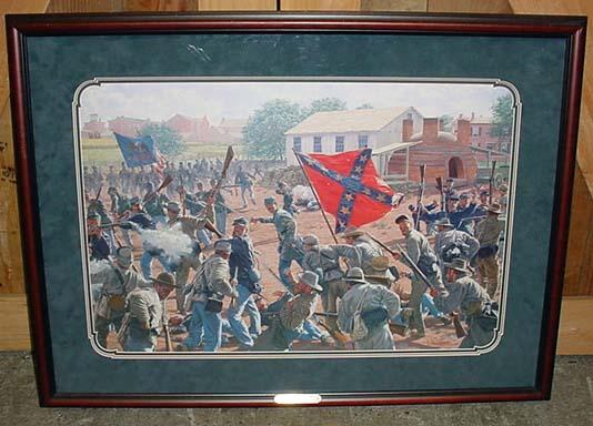 LARGE FRAMED LTD. ED. CIVIL WAR ART PRINT "BEDLAM IN THE BRICKYARD" BY SCHMEHL - Signed. Bradley Schmehl. No. 56 of 950. Comes with info in Back Pocket of Frame. Approx. 39.25" x 29.25". Some small scratches to frame