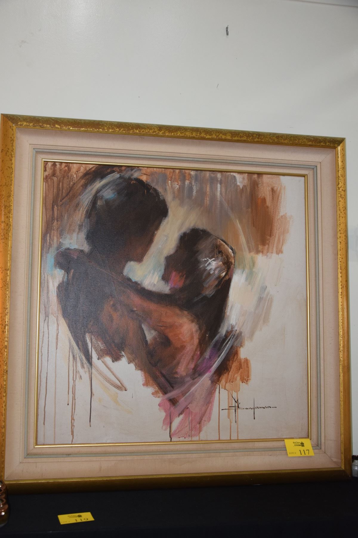 LARGE FRAMED OIL ON CANVAS, "LOVERS"; SIGNED (39 1/2" X 40")