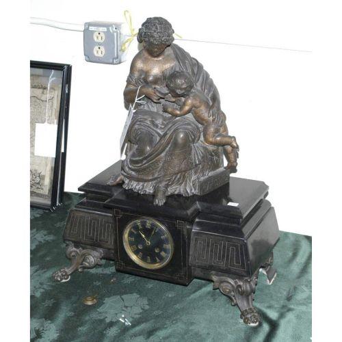 LARGE FRENCH MARBLE MANTLE CLOCK with associated statue top, 19th century, CONDITION REPORT: statue with oxidation and pitting and not attached.
