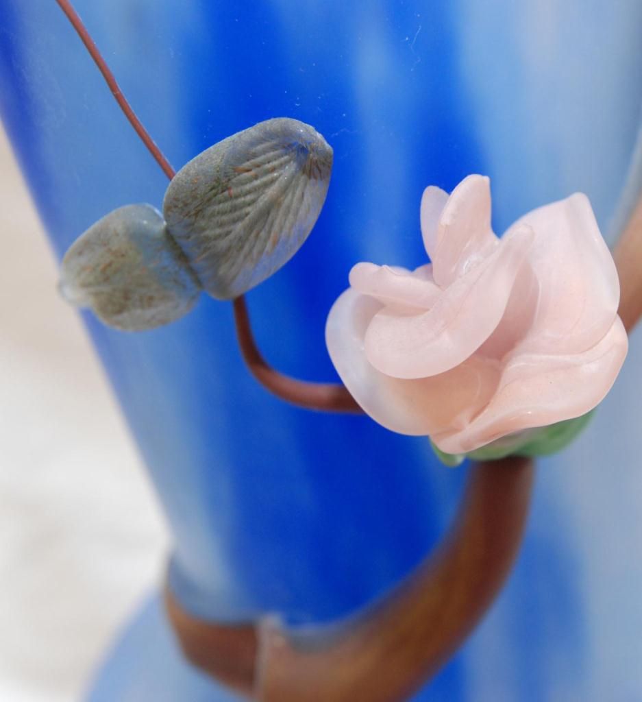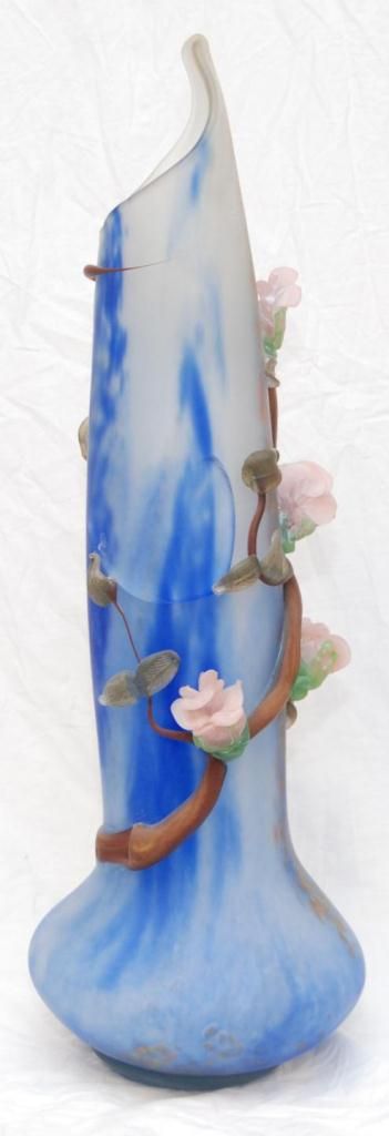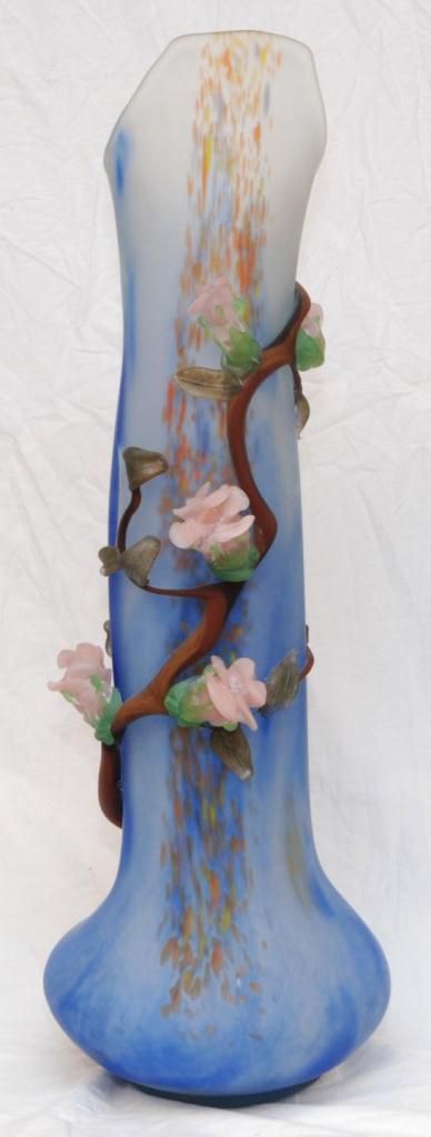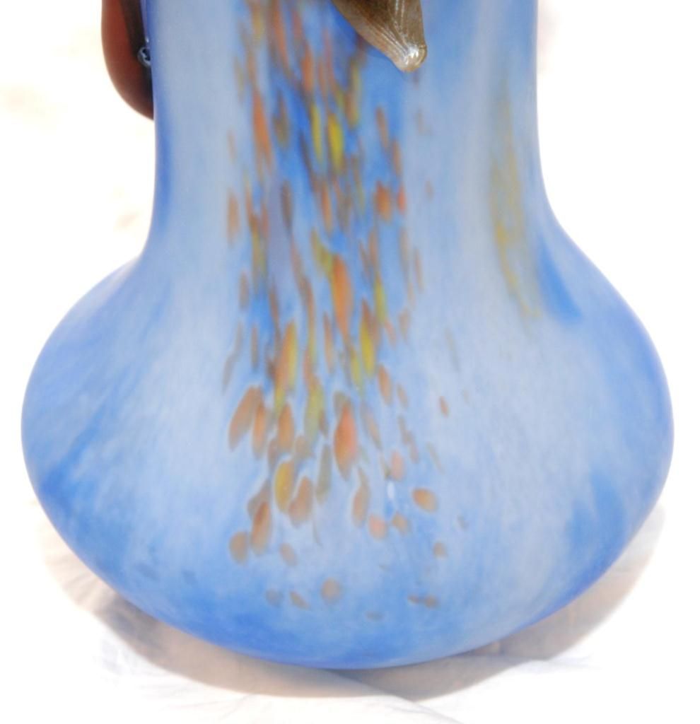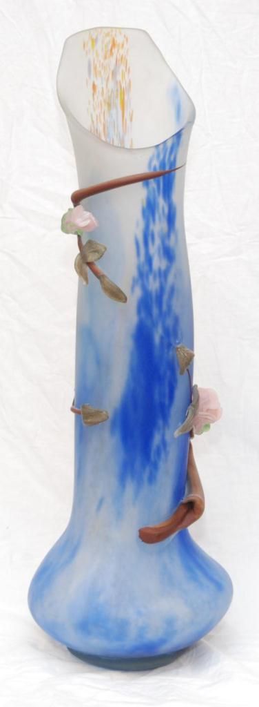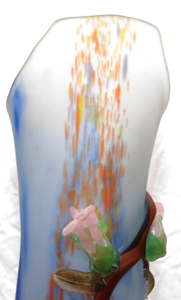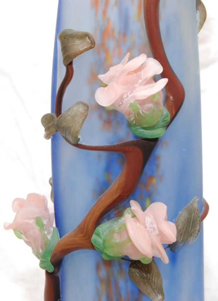 Large hand blown frosted art glass tubular vase having raised figural floral pink flower design throughout. Frosted clear and blue ground to vase with orange, blue and yellow spotting. Pontil mark to bottom. Signed to side of base. Measures 29 1/2" height (74.9cm). Total weight of 6.96 kilograms.