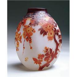 Lot 599 LARGE GALLE CHERRY BLOSSOM VASE A truly gorgeous cameo vase features brown, yellow and amber cherry blossoms and limbs against a frosted white background. The square shaped vase is completely encircled with cameo cherry blossoms. Signed on the side in cameo “Galle”. SIZE: 13-1/4” t x 8” w. CONDITION: Very good to excellent. 5-70589