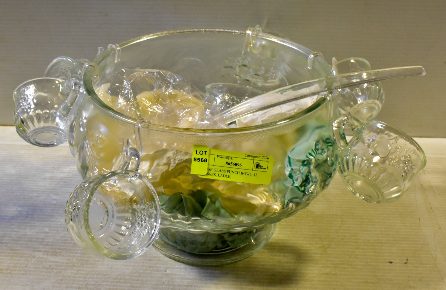 LARGE GLASS PUNCH BOWL, 12 GLASSES, LADLE,