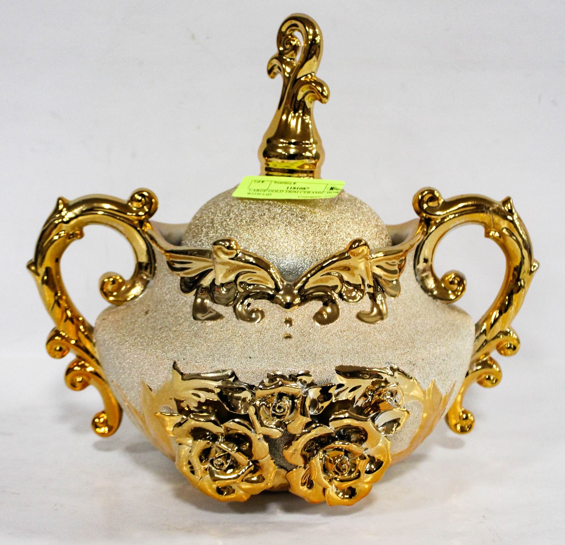 LARGE GOLD TRIM CERAMIC BOWL WITH LID