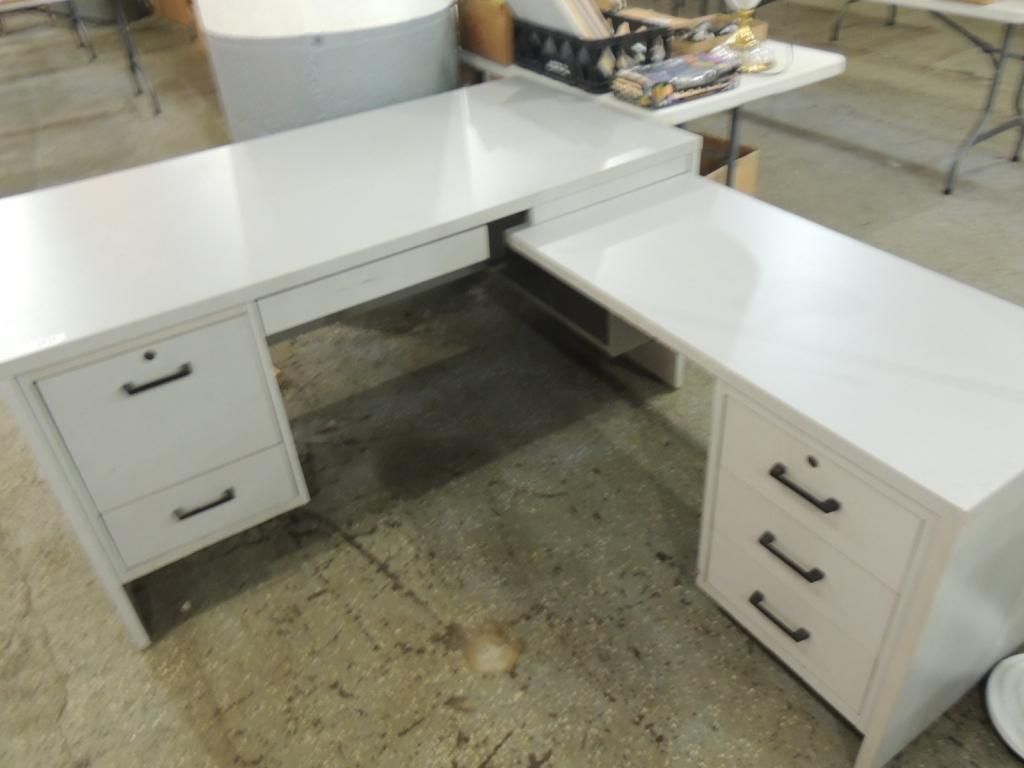 L SHAPED CORNER DESK OFFICE DESK DRAWERS AS SHOWN SEE PHOTO FOR MORE DETAILS.