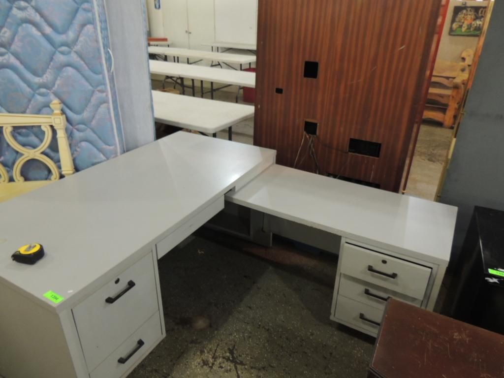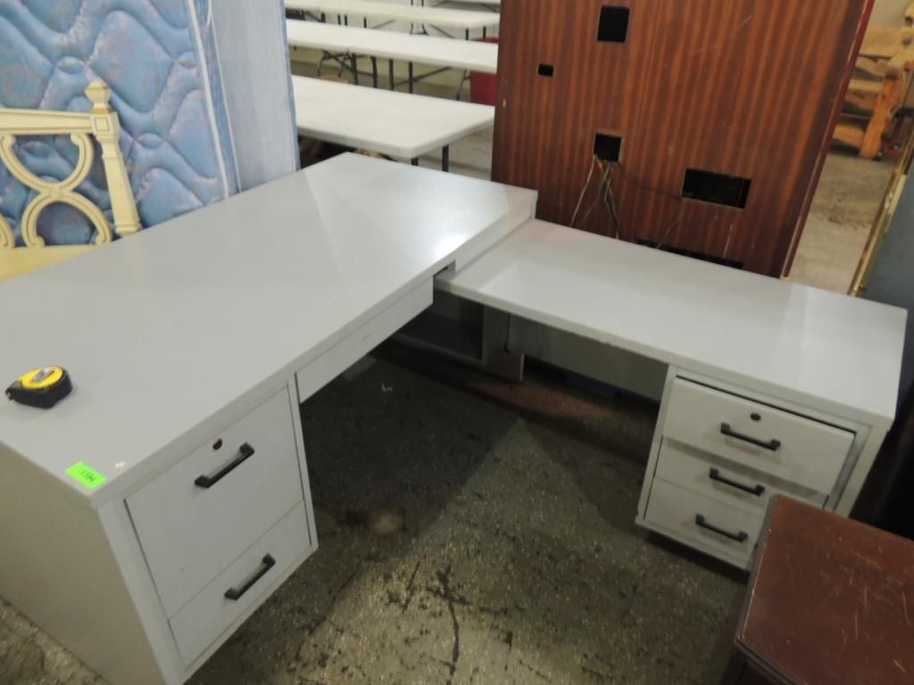 L SHAPED CORNER DESK OFFICE DESK DRAWERS AS SHOWN SEE PHOTO FOR MORE DETAILS.