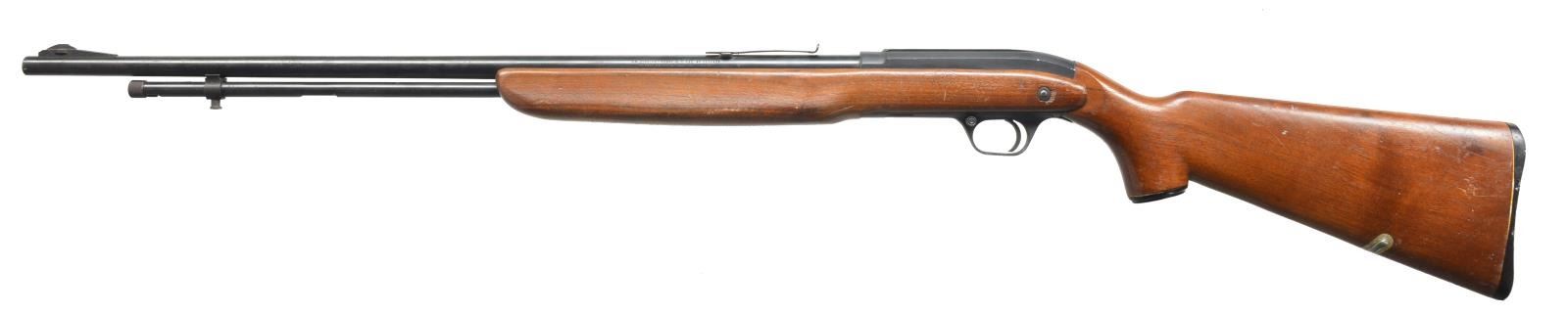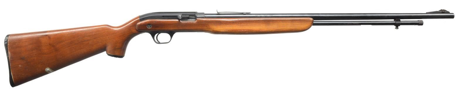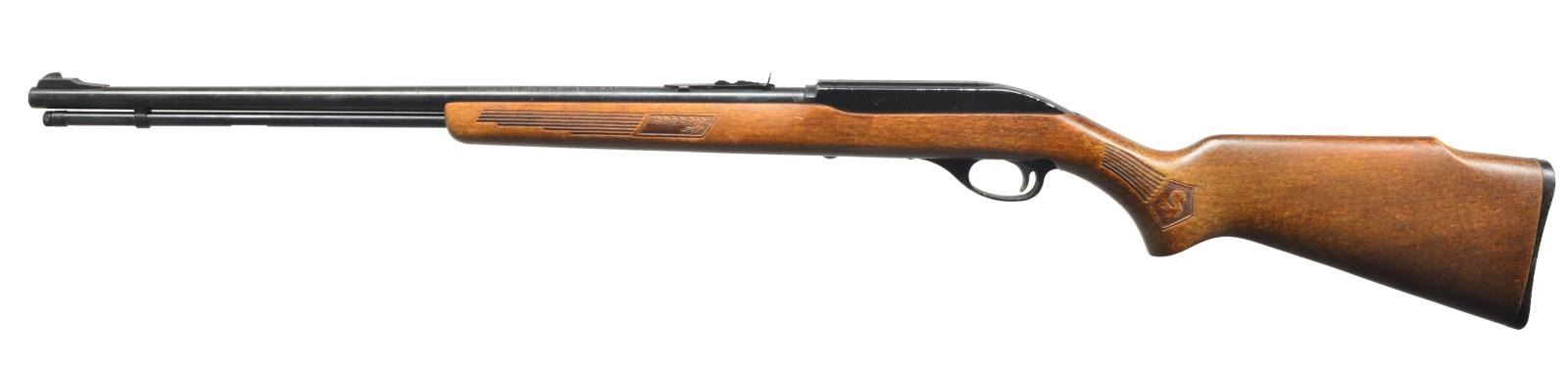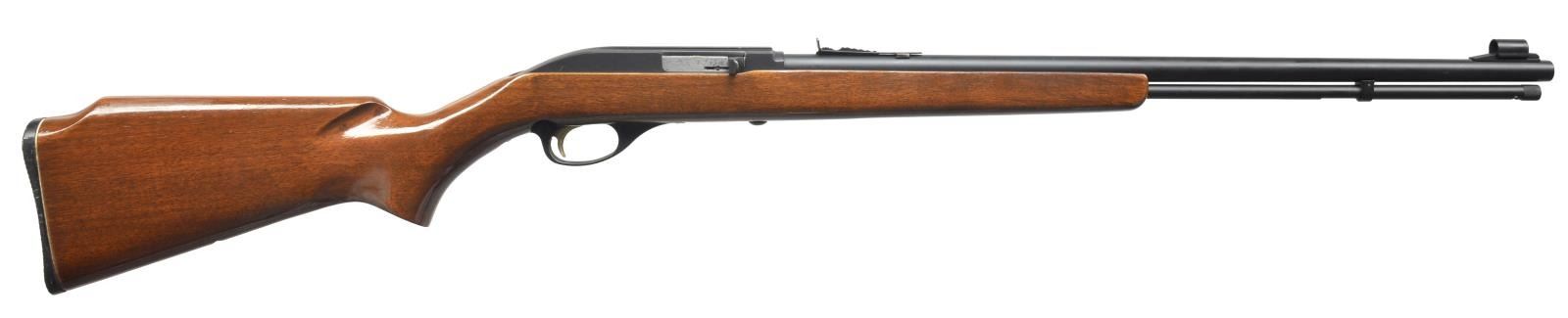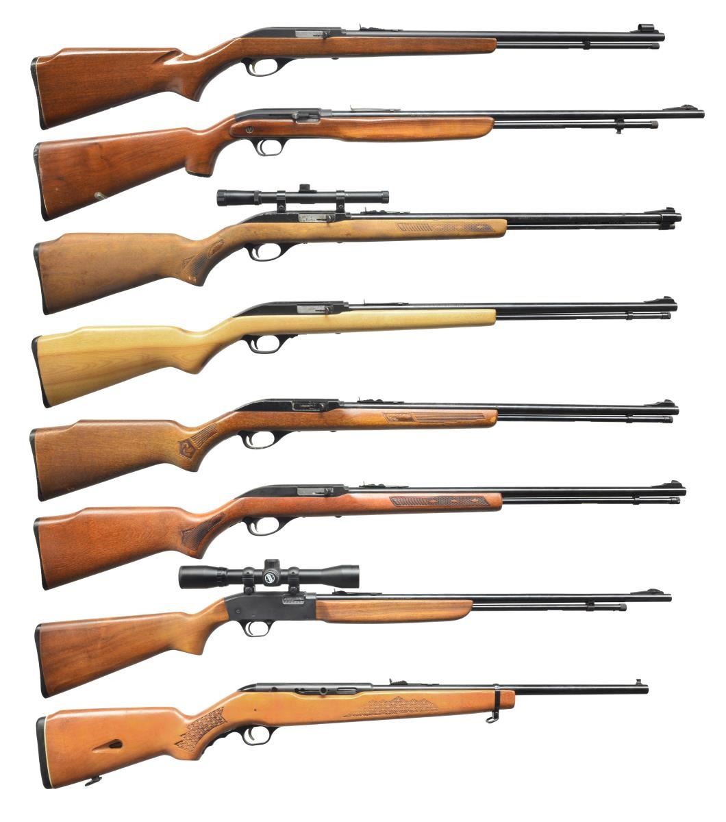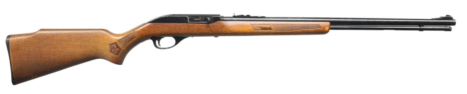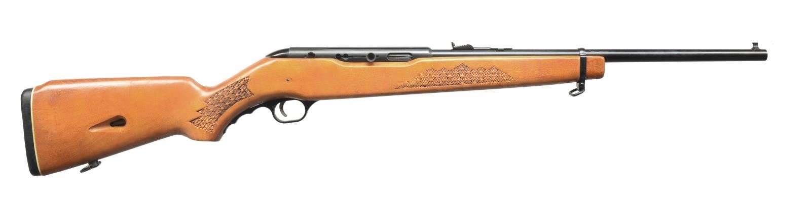 1) MARLIN 99 RIFLE. Cal. 22 LR. NSN. Bbl. 22" rnd. bbl. Screw on ramp front w/ dovetail bead sight & hood. Dovetail adj. rear sight. Receiver has groove. Uncheckered stock w/ Marlin hard rubber buttplate. CONDITION: bbl. has most of its original blue w/ some marks on muzzle. Receiver has most of its original blue w/ moderate handling marks. Ding on top of Monte Carlo. Bore is good. (20-3412/BT). 2) JC HIGGINS 31 RIFLE. Cal. 22 S, L, LR. NSN. Bbl. 24" rnd. bbl. Ramp front w/ dovetail bead sight & dovetail adj. rear missing elevator. Receiver is groove. Buttstock is equipped w/ retractable red sling. Uncheckered 2 piece stock w/ black hard rubber grip cap & black hard rubber JC Higgins buttplate, both w/ white line spacer. CONDITION: bbl. retains most of its original blue w/ a couple minor areas of surface oxidation & faint muzzle wear. Receiver has most of its original black w/ a couple of nicks & scratches. Stock retains original finish w/ buttstock having numerous nicks & dings as well as a crack on both sides from receiver into top pistol grip. Bore is good. (20-3413/BT). 3) MARLIN M 60 GLENFIELD RIFLE. Cal. 22 LR. S# 25343460. Bbl. 22" rnd. bbl. Band w/ blade front sight & dovetail adj. rear sight. Receiver is grooved & has 22 rings holding a Casco rimfire 4x15 scope w/ duplex reticle & scope caps. Checkered forend. Grip cap has checkering w/ oak leaves. Unmarked hard rubber buttplate. Forend & buttstock have vacant holes for sling swivels. CONDITION: bbl. has original blue w/ spotting of surface rust. Buttstock has been cleaned, retaining an open grain finish w/ a few handling marks. Receiver has original black w/ sharp edge wear, numerous nicks & scratches. Bore is dark. (20-3414/BT). 4) MARLIN M60 RIFLE. Cal. 22 LR. S# 11294873. Bbl. 22" rnd. bbl. Screw on ramp front w/ blade front sight & dovetail adj. rear sight missing elevator. Receiver is grooved. Uncheckered stock w/ Marlin hard rubber buttplate. Front of trigger guard is missing screw. CONDITION: bbl. has most of its original blue w/ a few light scratches. Receiver has most of its original black w/ some minor wear on groove. Stock has been stripped to appear like maple w/ a few handling marks. Bore is dark. (20-3415/BT). 5) MARLIN M60 GLENFIELD RIFLE. Cal. 22 LR. S# 23513349. Bbl. 22" rnd. Screw on ramp front w/ blade sight. Dovetail adj. rear. Grooved top receiver. Standard stock w/ checkered forend. Buttstock 7 parallel lines, checkered pistol grip & carved squirrel. Unmarked black rubber buttplate. Forend checkering is 7 parallel lines w/ oak leaf carving. CONDITION: bbl. retains original blue w/ areas of fine surface oxidation. Black anodized receiver has some nicks & scratches as well as wear on sharp edges. Stock has original finish w/ some hand wear, nicks & scratches. Bore is good. (20-3416/BT). 6) MARLIN M60 GLENFIELD RIFLE. Cal. 22 LR. S# 20457853. Bbl. 22" rnd. bbl. Screw on ramp front blade sight & dovetail adj. rear sight. Receiver is grooved. Stock has minimal checkering pattern on both side of forend & checkered pistol grip w/ oak leaves. Unmarked hard rubber buttplate. CONDITION: bbl. retains most of its original blue. Receiver has most of its original black finish w/ a few minor handling marks. Stock has original finish w/ some minor wear on back of Monte Carlo stock. Stock still has original sticker on forend. Bore is good w/ some minor pits near muzzle. (20-3417/BT). 7) JC HIGGINS 28 RIFLE. Cal. 22 LR. NSN. Bbl. 24" rnd. bbl. Ramp front w/ dovetail blade front sight & dovetail adj. rear sight. Receiver has grooves w/ 22 scope rings & a Bushnell scope w/ duplex reticle. Uncheckered forend & uncheckered buttstock w/ JC Higgins hard rubber buttplate. CONDITION: bbl. has original blue w/ minor muzzle wear & a couple minor scuffs. Receiver has original black finish w/ a couple minor marks. Forend has original finish w/ a few handling marks. Butt stock has original finish w/ crack on both sides from receiver back about an inch. Bore is good. (20-3418/BT). 8) WESTERNFIELD 846 RIFLE. Cal. 22 LR. S# 333365. Bbl. 18". Dovetail bead front sight & dovetail adj. rear sight. Grooved top receiver. Stock has press checkering & left side cheekpiece. Thick black unmarked hard rubber buttplate. Sling swivels included. CONDITION: bbl. retains most of its original blue w/ a couple minor marks near muzzle. Receiver has most of its original blue. Stock retains its original finish w/ a couple marks on edge of cheekpiece. Bore is good. (20-3419/BT). ALL MODERN. $1,300-1,900.
