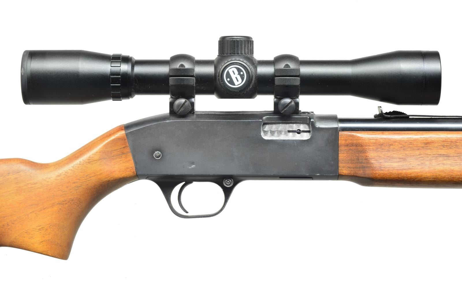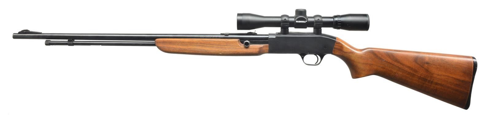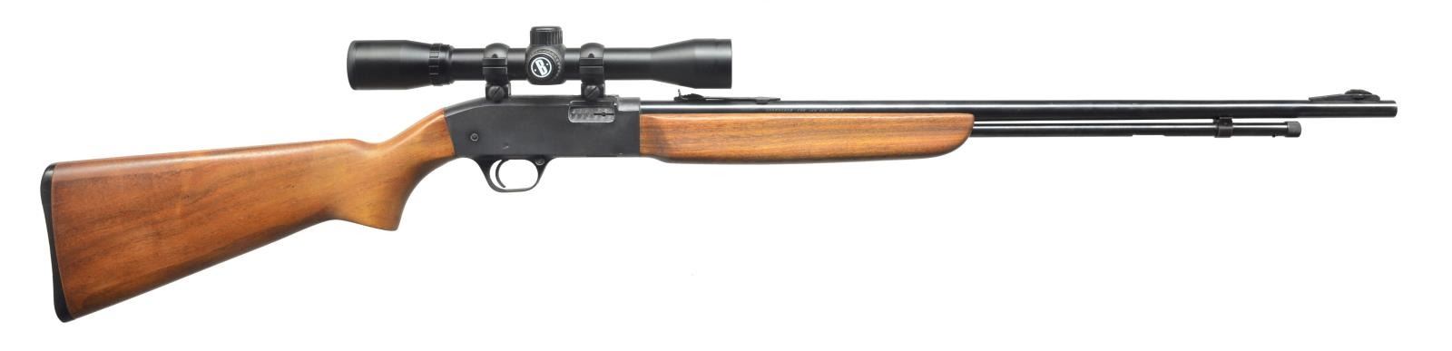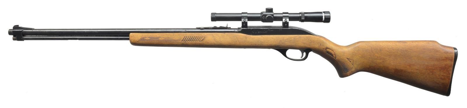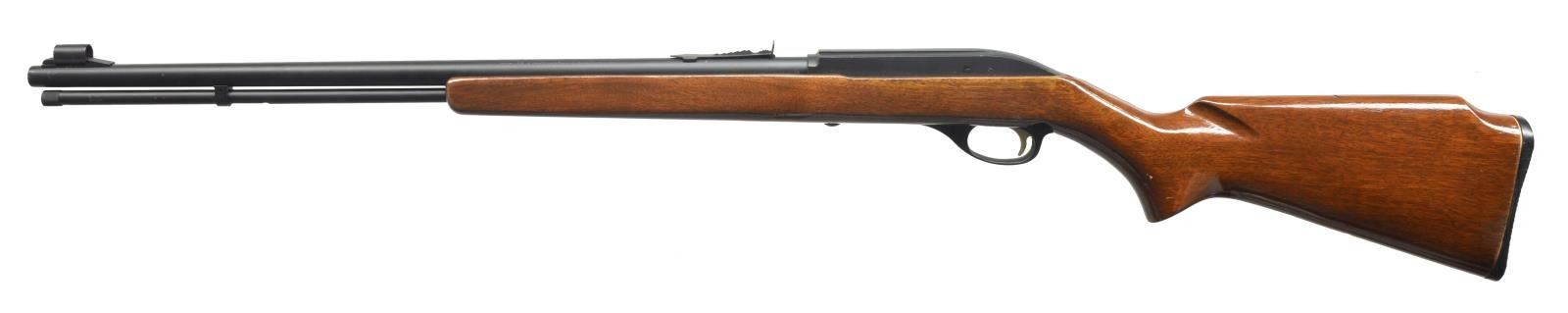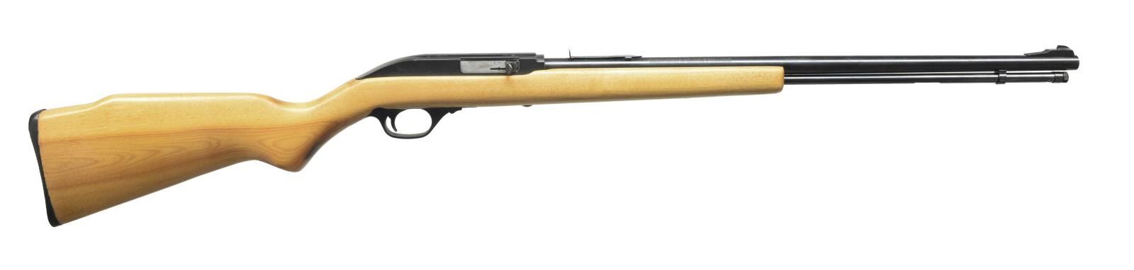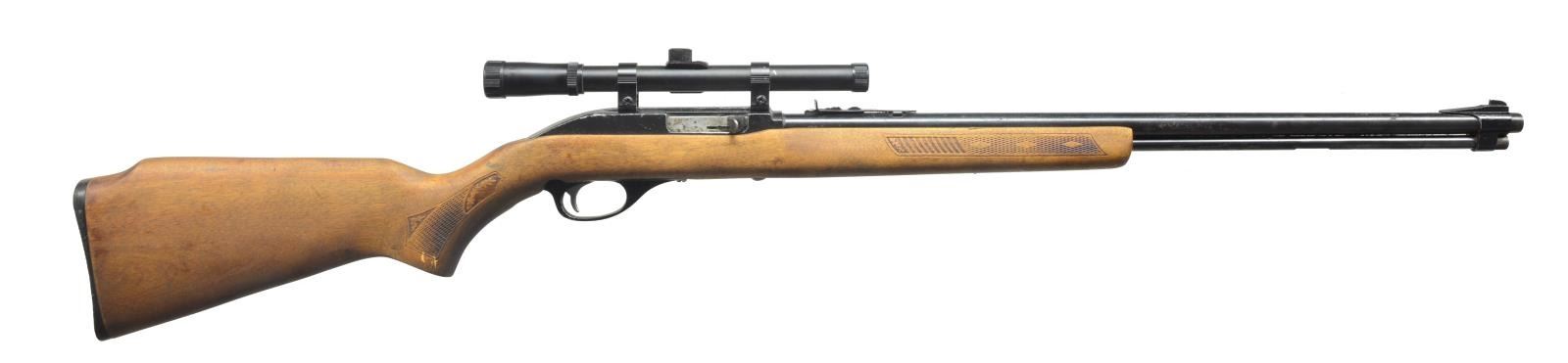 1) MARLIN 99 RIFLE. Cal. 22 LR. NSN. Bbl. 22" rnd. bbl. Screw on ramp front w/ dovetail bead sight & hood. Dovetail adj. rear sight. Receiver has groove. Uncheckered stock w/ Marlin hard rubber buttplate. CONDITION: bbl. has most of its original blue w/ some marks on muzzle. Receiver has most of its original blue w/ moderate handling marks. Ding on top of Monte Carlo. Bore is good. (20-3412/BT). 2) JC HIGGINS 31 RIFLE. Cal. 22 S, L, LR. NSN. Bbl. 24" rnd. bbl. Ramp front w/ dovetail bead sight & dovetail adj. rear missing elevator. Receiver is groove. Buttstock is equipped w/ retractable red sling. Uncheckered 2 piece stock w/ black hard rubber grip cap & black hard rubber JC Higgins buttplate, both w/ white line spacer. CONDITION: bbl. retains most of its original blue w/ a couple minor areas of surface oxidation & faint muzzle wear. Receiver has most of its original black w/ a couple of nicks & scratches. Stock retains original finish w/ buttstock having numerous nicks & dings as well as a crack on both sides from receiver into top pistol grip. Bore is good. (20-3413/BT). 3) MARLIN M 60 GLENFIELD RIFLE. Cal. 22 LR. S# 25343460. Bbl. 22" rnd. bbl. Band w/ blade front sight & dovetail adj. rear sight. Receiver is grooved & has 22 rings holding a Casco rimfire 4x15 scope w/ duplex reticle & scope caps. Checkered forend. Grip cap has checkering w/ oak leaves. Unmarked hard rubber buttplate. Forend & buttstock have vacant holes for sling swivels. CONDITION: bbl. has original blue w/ spotting of surface rust. Buttstock has been cleaned, retaining an open grain finish w/ a few handling marks. Receiver has original black w/ sharp edge wear, numerous nicks & scratches. Bore is dark. (20-3414/BT). 4) MARLIN M60 RIFLE. Cal. 22 LR. S# 11294873. Bbl. 22" rnd. bbl. Screw on ramp front w/ blade front sight & dovetail adj. rear sight missing elevator. Receiver is grooved. Uncheckered stock w/ Marlin hard rubber buttplate. Front of trigger guard is missing screw. CONDITION: bbl. has most of its original blue w/ a few light scratches. Receiver has most of its original black w/ some minor wear on groove. Stock has been stripped to appear like maple w/ a few handling marks. Bore is dark. (20-3415/BT). 5) MARLIN M60 GLENFIELD RIFLE. Cal. 22 LR. S# 23513349. Bbl. 22" rnd. Screw on ramp front w/ blade sight. Dovetail adj. rear. Grooved top receiver. Standard stock w/ checkered forend. Buttstock 7 parallel lines, checkered pistol grip & carved squirrel. Unmarked black rubber buttplate. Forend checkering is 7 parallel lines w/ oak leaf carving. CONDITION: bbl. retains original blue w/ areas of fine surface oxidation. Black anodized receiver has some nicks & scratches as well as wear on sharp edges. Stock has original finish w/ some hand wear, nicks & scratches. Bore is good. (20-3416/BT). 6) MARLIN M60 GLENFIELD RIFLE. Cal. 22 LR. S# 20457853. Bbl. 22" rnd. bbl. Screw on ramp front blade sight & dovetail adj. rear sight. Receiver is grooved. Stock has minimal checkering pattern on both side of forend & checkered pistol grip w/ oak leaves. Unmarked hard rubber buttplate. CONDITION: bbl. retains most of its original blue. Receiver has most of its original black finish w/ a few minor handling marks. Stock has original finish w/ some minor wear on back of Monte Carlo stock. Stock still has original sticker on forend. Bore is good w/ some minor pits near muzzle. (20-3417/BT). 7) JC HIGGINS 28 RIFLE. Cal. 22 LR. NSN. Bbl. 24" rnd. bbl. Ramp front w/ dovetail blade front sight & dovetail adj. rear sight. Receiver has grooves w/ 22 scope rings & a Bushnell scope w/ duplex reticle. Uncheckered forend & uncheckered buttstock w/ JC Higgins hard rubber buttplate. CONDITION: bbl. has original blue w/ minor muzzle wear & a couple minor scuffs. Receiver has original black finish w/ a couple minor marks. Forend has original finish w/ a few handling marks. Butt stock has original finish w/ crack on both sides from receiver back about an inch. Bore is good. (20-3418/BT). 8) WESTERNFIELD 846 RIFLE. Cal. 22 LR. S# 333365. Bbl. 18". Dovetail bead front sight & dovetail adj. rear sight. Grooved top receiver. Stock has press checkering & left side cheekpiece. Thick black unmarked hard rubber buttplate. Sling swivels included. CONDITION: bbl. retains most of its original blue w/ a couple minor marks near muzzle. Receiver has most of its original blue. Stock retains its original finish w/ a couple marks on edge of cheekpiece. Bore is good. (20-3419/BT). ALL MODERN. $1,300-1,900.
