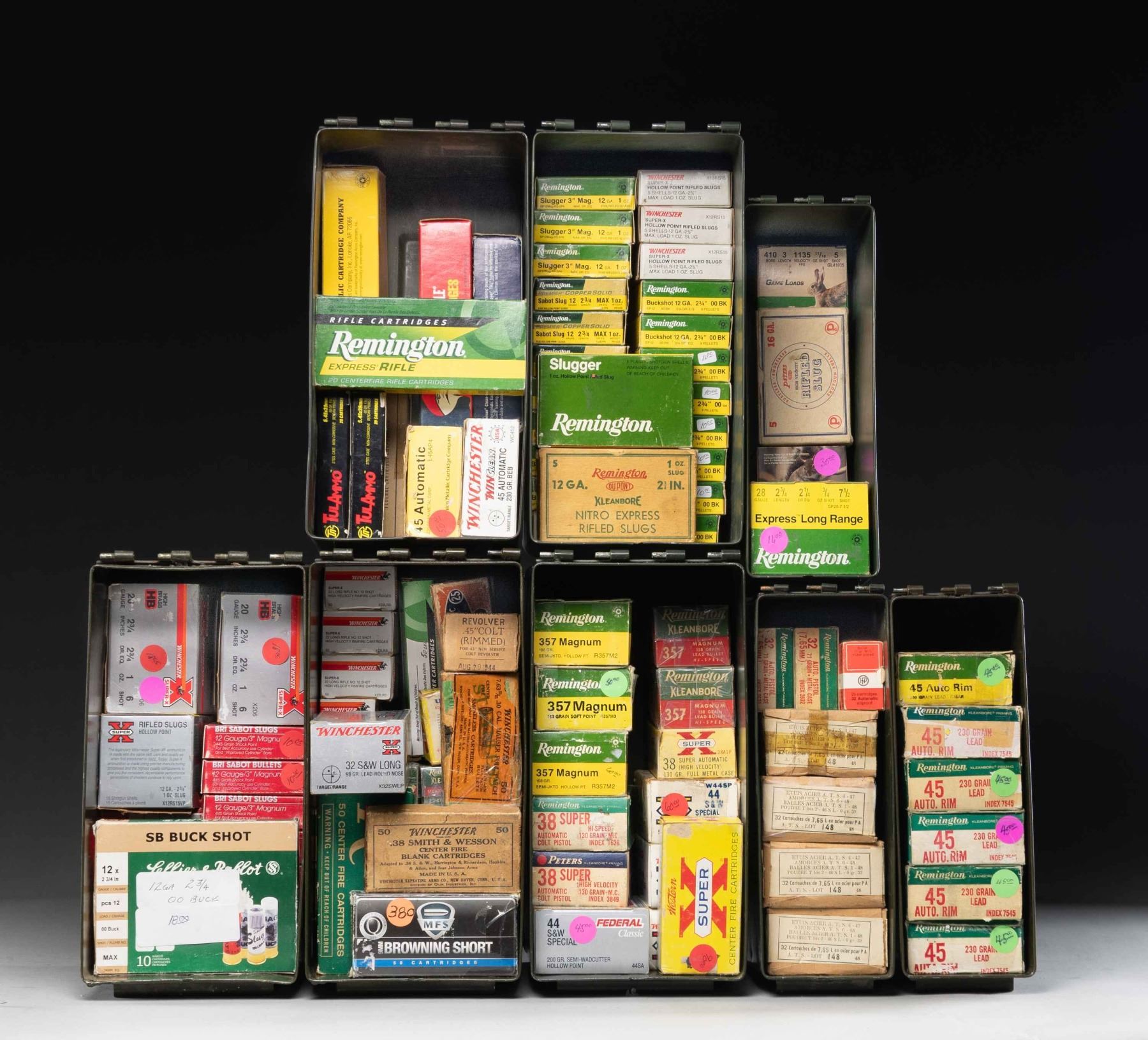 All appears fine serviceable ammo of later production packed in 8 GI style ammo cans (3-30's & 5-50's). Mostly full boxes with some conservatively estimated partials noted. Most boxes have a bright colored round sticker with a price listed. RIMFIRE AMMO: 3 Remington yellow-green boxes of 5MM Magnum with 38 grain HP bullets. / 1 Winchester 22 Mag. with JHP bullets. / 3 Winchester Super-X 22 LR No. 12 Shot; X22LRS. / 8 Remington 22 LR Thunderbolt. / 3 Remington Kleanbore 22 LR Standard Velocity #6122; 1 bight green box & 2 dark green. / 2 Remington 22 CB Caps (100 each). / 3 Winchester 22 LR Blanks. / RIFLE AMMO: 2 TulAmmo (20 rds. each) 5.45X39 being steel cased, Berdan primed & non-corrosive with 60 grain FMJ bullets. / 1 Remington yellow-green 20 rd. box of 17 Remington (R17R2) with 25 grain HP bullets. / HANDGUN AMMO: (50 rd. boxes unless noted) 1 vintage Winchester 30 Mauser with Full Patch bullets. / 2 Russian 9X18 Makarov with FMJ bullets. / 1 Remington green-white box (45 rds.) 38 S&W #2338 with 146 grain lead bullets. / 1 MFS 9MM Browning Short (380 ACP) FMJ; full box but 5 are S&W brand. / 2 Remington yellow-green 357 Mag. (R357M2) with 158 grain Semi-Jktd HP bullets. / 1 Remington yellow-green 357 Mag. (R357M3) with 158 grain SP bullets. / 2 especially nice Remington Kleanbore 357 Mag. with 158 grain lead bullets. / 2 Western Super-X yellow boxed 38 Super Auto High Velocity with 130 grain F.M.C. bullets. / 1 Remington green-white 38 Super Hi-Speed #1638 with 130 grain MC bullets. / 1 Peters 38 Super High Velocity #3849 with 130 grain MC bullets. / 2 Winchester Western 44 Spl. (X44SP) with 246 grain lead bullets. / 1 Winchester X 44 Spl. (W44SP) with 246 grain lead bullets. / 1 Federal 44 Spl. (44SA) with 200 grain Semi-Wadcutter HP bullets. / 1 Remington 25 Auto (L25AP) with 50 grain MC bullets. / 3/4 box of US Cartridge Co. 25 Auto in vintage 2 piece box; MC bullets. / 1 Winchester yellow box of 32 S&W blanks. / 1 Winchester vintage 2 piece box of 38 S&W blanks. / 1 vintage Canadian military box (12 rds.) 45 Auto Rim marked "12 Cartridges, Revolver, .45" Colt, (Rimmed), For 45" New Service, Colt Revolver, Aug 29, 1944" with FMJ bullets. / 1 Winchester Super-X 32 S&W Long (X32SWLP) with 98 grain lead RN bullets. / 1 1/2 boxes of Western X 32 Auto (32 ACP) with 71 grain FMC bullets; 32AP. / 1/2 Remington Kleanbore 32 Auto with 71 grain MC bullets. / 1 Winchester Super-X 32 Auto (X32ASHP) with 60 grain Silvertip HP bullets. / 3/4 box of Winchester 32 Auto (Q4255) with 71 grain FMJ bullets. / 1 Remington 32 Auto (L32AP) with 71 grain MC bullets. / 2 white-green boxes of Remington 32 Auto (#2632) with 71 grain MC bullets. / 3/4 Magtech 32 Auto (32B) with 71 grain JHP bullets. / 1 mixed brand 20 rd. box of 32 Auto Premium to include Federal HP and Winchester Silvertips. / 3 (25 rd. boxes) Hirtenberg with 71 grain MC bullets. / 4 Etuis Acier (translates to "steel cases"; 48 rds. each) 32 Auto with FMJ bullets. / 5 Remington green-white boxes of 45 Auto Rim (#7545) with 230 grain lead bullets. / 1 Remington green-yellow box of 45 Auto Rim (R45AR) with 230 grain lead bullets. / 1 American Eagle 45 ACP (AE45A) with 230 grain FMJ bullets. / 1 Speer Lawman 45 ACP with 230 grain FMJ bullets. / 1 US military 45 ACP by Federal with 230 grain FMJ bullets and headstamps of "FC 64". / 1 (48 rds.) Remington UMC 45 ACP (L45AP4) with 230 grain MC bullets. / 2 (96 rds.) mixed of mostly 230 grain FMJ but includes 25+ of HP's. / SHOTGUN AMMO: 4 Remington 410 ga. 3" (GL41035) with 11/16 oz. #5 shot. / 1 Remington 28 ga. 2 3/4" (SP28-7 1/2) with 3/4 oz. of #7 1/2 shot. / 1 Peters (5 pack) 16 ga. 2 9/16" slugs of 7/8 oz. / 2 Winchester Super-X 20 ga. 2 3/4" with 1 oz. of #6 shot. / 12 GAUGE BUCKSHOT: 8 Remington 2 3/4" (SP12 00BK) 9 pellets of 00 Buck in 5 rd. packs. / 4 Remington 2 3/4" (SP12S Mag.) 20 pellets of No. 1 buck in 5 rd. packs. / 1 Western super-X 2 3/4" (SX12RB5PK) 9 pellets of 00 buck in 5 rd. pack. / 1 S&B 12 rd. pack of 2 3/4" 00 buck. / 12 GAUGE SLUGS: 3 Remington 3" Mag. with 1 oz. HP slugs in 5 rd. packs. / 3 Remington 2 3/4" Max. with 1 oz. HP slugs in 5 rd. packs. / 1 Remington 2 3/4" with 1 oz. HPRS rifled slugs in 5 rd. packs. / 1 vintage Remington Kleanbore Nitro Express 2 3/4" with 1 oz. slugs in 5 rd. pack. / 3 Winchester Super-X 2 3/4" Max (X12RS15) with 1 oz. slugs in 5 rd. packs. / 2 Winchester Super-X 2 3/4" (X12RS15VP) with 1 oz. slugs in 15 rd. Value Packs. / 7 BRI 3" (plus 2 rds.) Sabot Slugs (445 grain Shock Point) in 5 rd. packs. (02-25258-4/NW). $1,000-1,500.