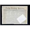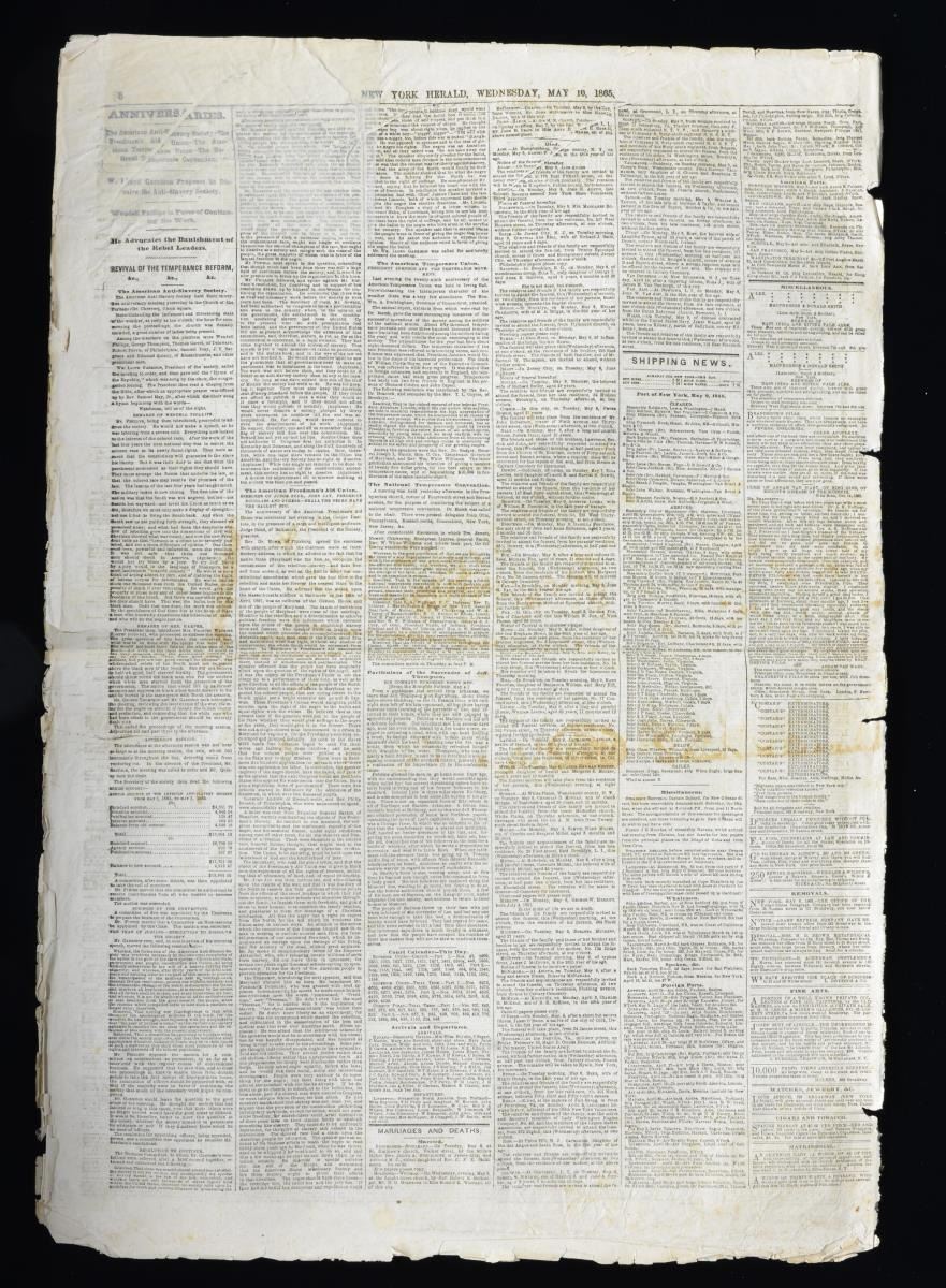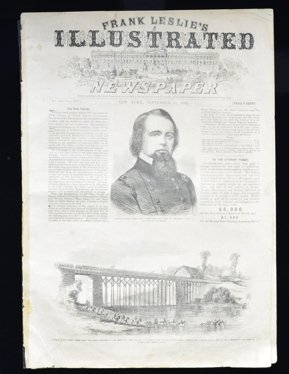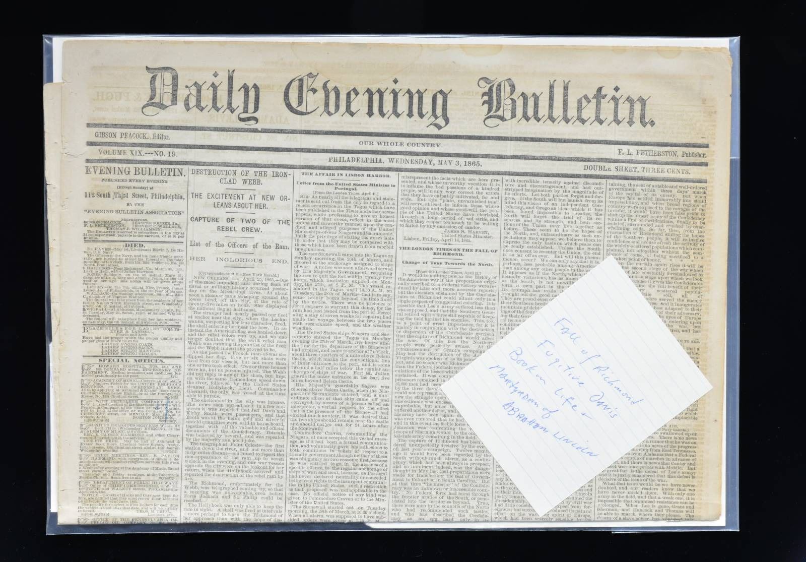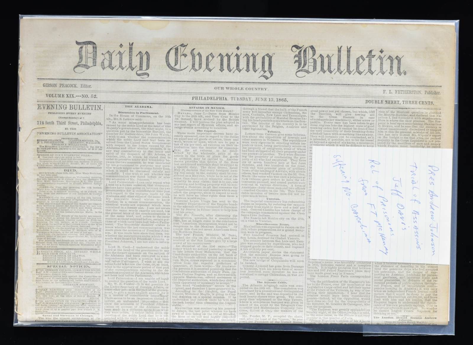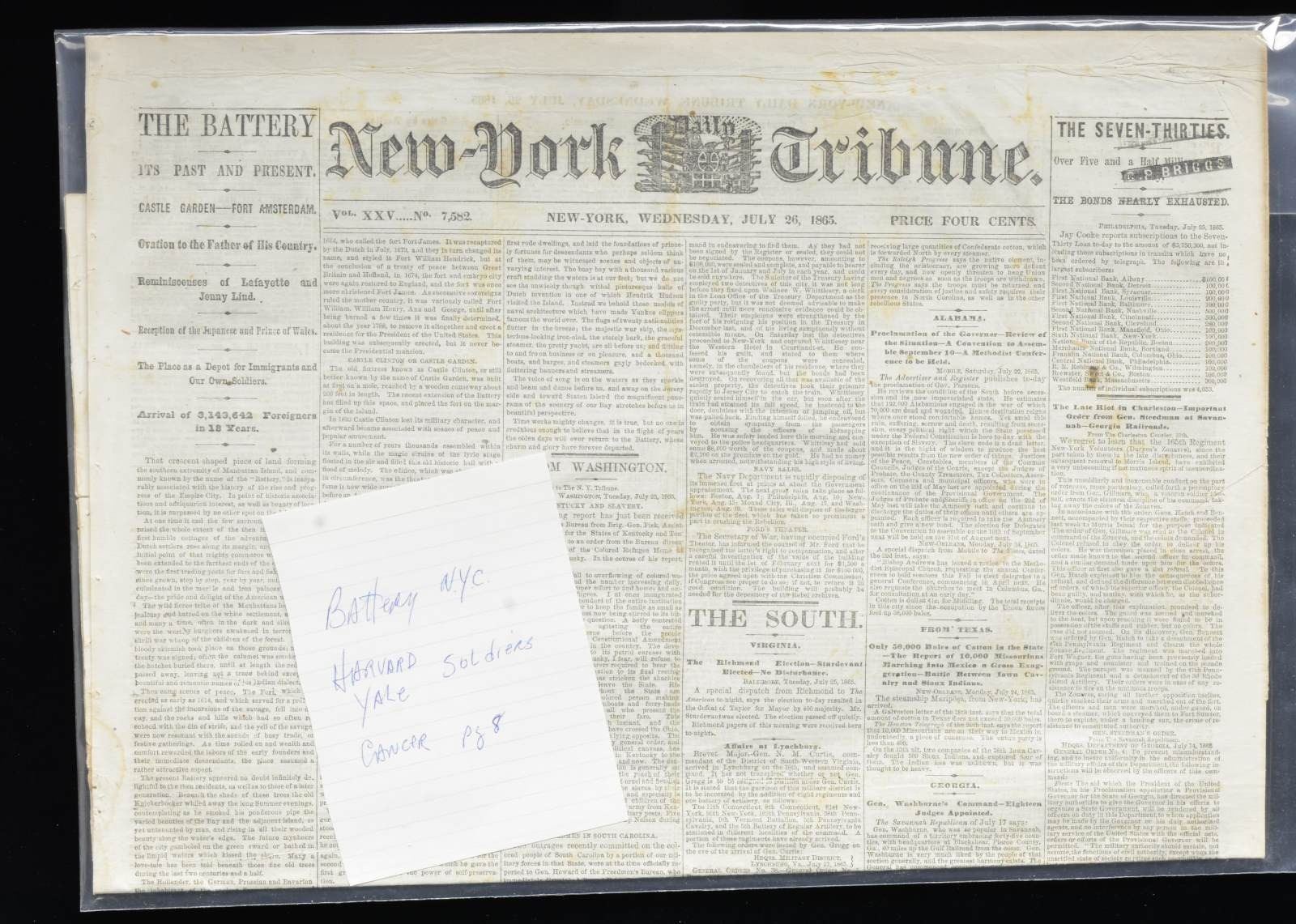 1) Group of 75+ Civil War era newspapers. 2) Fitz John Porter, ANS pencil, battle order, suspect. 3) Folio muster out role of Company K, 82nd Pennsylvania Volunteer Infantry. 4) Program from 1904 GAR encampment, Boston. 5) Fernald, Granville “The Story of the 1st Defenders”, 24 pages, wraps, inserted documents. CONDITION: fair, wraps loose, chipped & stained. 6) Pamphlet, “The Flags of the Confederate States of America”, 1907, wraps, color plate. CONDITION: very good. 7) Long, James “Gettysburg: How the Battle Was Fought” 1891, wraps, 98 pages. CONDITION: fair, missing rear wrap. 8) “The Confederate States Almanac And Repository for Useful Knowledge 1862”. Reprint by Atlanta Confederate veterans camp, wraps, 96 pages. CONDITION: missing rear wrap. 9) Prayers & Other Devotions for the Use of the Soldiers of the Army of the Confederate States, no date, Charleston, 12 pages, wraps. CONDITION: very good. 10) 2 Discharge documents w/ eagle vignette, Jacob G Creighton, 2nd independent Battery Light Artillery Ohio; Alexander A Lee, Co. G, 115th New York infantry. 11) Small archive of David Curry, Co. D, 124th NY. Quarter plate tintype of David & fellow soldier, one war date letter, 2 war date letters from brother Thomas, 3 prewar letters from San Francisco gold fields, enlistment paper w/ eagle vignette. 12) 16 x 16" silk handkerchief, American flag border, interior camp scene, circa 1900. CONDITION: fine. 13) 3 Pieces of Confederate currency. 14) Additional 40-50 misc. letters, receipts, documents & photographs, mostly post Civil War. (02-14426/JS). $500-1,000.