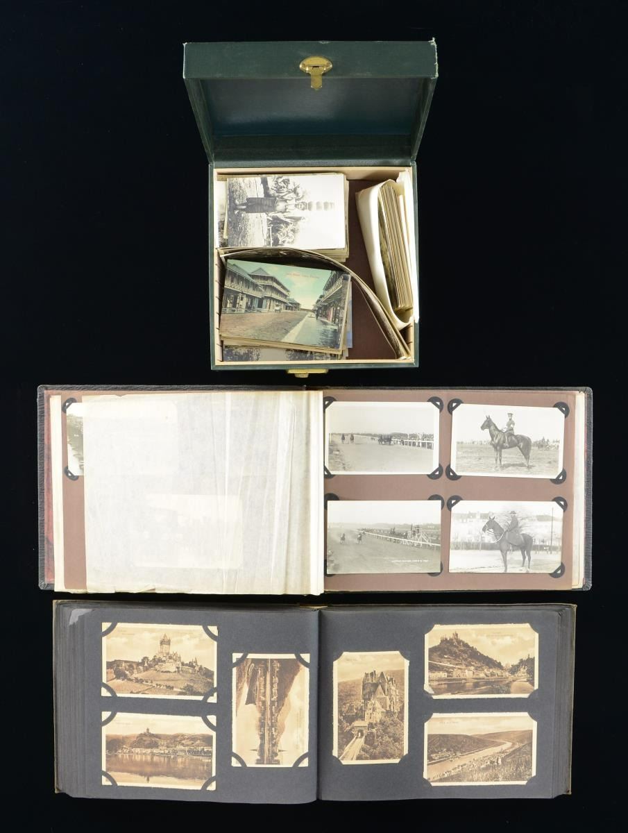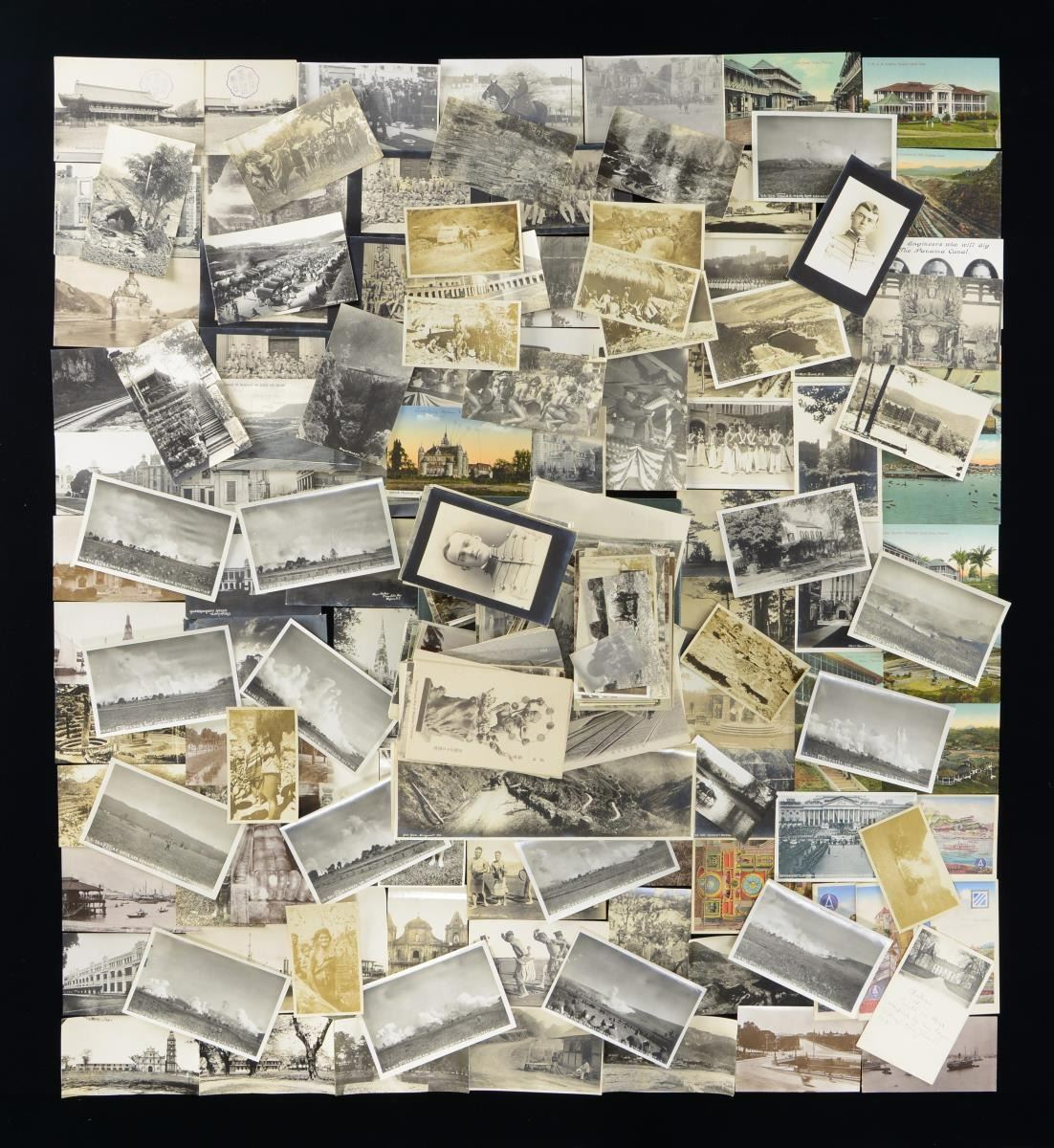 About 500 postcards, most real photos, most WW1 or earlier, many travel related to Asia, WW1 from Europe, most military. Many postally used by Fred Sladen sending them home. One album has about half the lot and the rest are loose. Some are just postcard sized with no imprints on verso. CONDITION: good to very good overall. (02-17895-17/JS). $500-1,000.