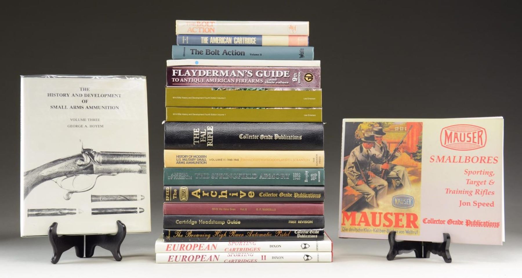 1) Collector Grade Publications: The Browning High Pistol by R. Blake Stevens. 2) Cartridge Headstamp Guide, First Revision by Henry P. White. 3) 30-06 We Have Seen Vol. II by Gerald Marcello, Volume 1 inside the book. 4) Collector Grade Publications: The Mauser Archive by Jon Speed. 5-6) Volumes I & 2 of M14 Rifle History And Development Fourth Edition by Lee Emerson. 7) 9th Edition Flayderman's Guide to American Firearms. 8) The Shotshell in the United States by Richard Iverson. 9) Collector Grade Publications: Mauser Smallbores Sporting, Target and Traiing RIfles by Jon Speed. 10) Arsenal of Freedom: The Springfield Armory 1890-1948 by Lt. COl. William S. Brophy. 11) Collector Grade Publications: The FAL Rifle, Limited Edition private bound series containing all 3 FAL volumes. 12-13) The Bolt Action, Volume I & II by Stuart Otteson. 14) Volume II: History of Modern U.S. Military Small Arms Ammunition 1940-1945 by F. W. Hackley. 15) The American Cartridge by Charles R. Suydam. 16) Volume III: The History and Development of Small Arms Ammunition by George A. Hoyem. 17-18) Volumes I & II European Sporting Cartridges by W. B. Dixon. CONDITION: books good to very good with light wear & occasional tear of dust jacket. PROVENANCE: The Collection of Gun Sport Ltd owned by Jon R. Thomas. (02-20606-4/MD). $450-900.
