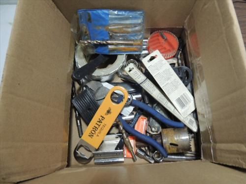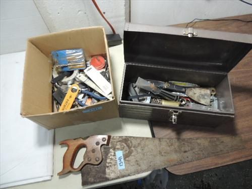 LARGE GROUP OF HAND TOOLS: CROSS CUT SAW, TOOL BOX WITH HACK SAW, PUTTY KNIVES, DRUILL BITS AND MUCH MORE. AS SHOWN. VIEW PICTURE FOR DETAIL.