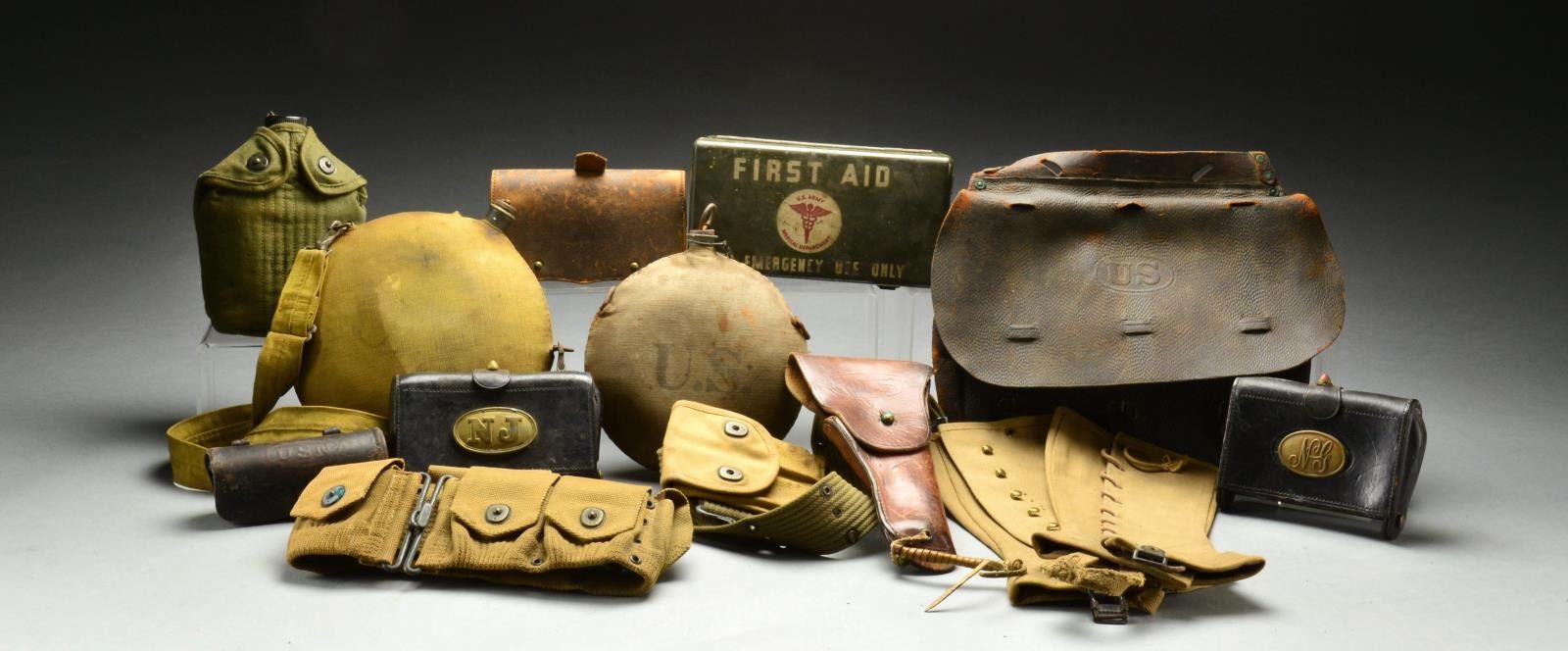 This varied group includes 1 Spanish American War era canteen stenciled, “1VT.”. Stopper is present & there is a sewn on short sling. / 2 Mills style cartridge belts in tan w/ “C” type closures. / 1 Spanish American canteen stenciled, “U.S. / 11” on 1 side & “A” over crossed cannons on the other. Stopper is present. No sling. / 1 Spanish American War era canteen stenciled, “U.S.”. Partial stopper. Leather sling. / 1 Lg. size Spanish American War medical canteen stenciled, “U.S.” w/ a greenish tan sling. / 1 Tan canvas Spanish American War haversack stenciled, “US” on the outer flag. The inner flap reads, “Capt. A. Renoe, Company F THIRD INFT’Y ILL. VOL.”. / 1 WWII canteen w/ cover. / 1 Indian War leather haversack w/ “US” in oval embossed on the front. / 1 Spanish American War khaki infantry tunics for a corporal. / 1 Spanish American War khaki tunic w/ no insignia. / 1 Spanish American War canteen stenciled, “U.S.” on the front. Stopper is present. No sling. / 1 WWI canteen w/ canvas cover on a canvas web belt. / 1 US Army Medical Dept. First Aid kit. / 2 Pairs of canvas puttees. / 1 Pair of leather puttees. / 5 Brown russet leather holsters for a .45 Auto. / 1 Brown russet leather holster for a .45 Auto on canvas web belt w/ a clip pouch. / 3 Black leather holsters for .45 Auto. / 1 Unissued black leather shoulder holster. / 1 Mills cartridge belt dated May 1918 w/ 10 pockets. / 1 Brown russet leather shoulder holster. / 1 Current issue desert camouflage hat. / 3 Black leather pistol cartridge pouches embossed, “USN” in oval on the front. / 12 Assorted canvas cartridge pouches. / 1 WWI Red Cross sewing kit. / 1 Bronze colored “U.S.” garrison belt, 2 piece buckle. / 1 Leather belt. / 1 British change purse. / A 3 Piece officer’s folding knife, fork & spoon set. / 3 Lighters. / 1 Sewing kit. / British military buttons & pins. / 1 Frazier cartridge box. / 1 McKeever cartridge box w/ a brass, “NJ” plate on the front. / 1 McKeever cartridge box w/ a brass, “NG” plate on the front. / 1 McKeever cartridge box w/ a embossed “US” in oval on the front. / 1 Pair of late 20th century Army officers pants. / 1 Camouflaged net. CONDITION: most items show light to moderate wear. Many cloth items have moderate staining. Uniforms show edge wear. Several canteens have rust spots. (02-14340/BF). $1,000-1,500.