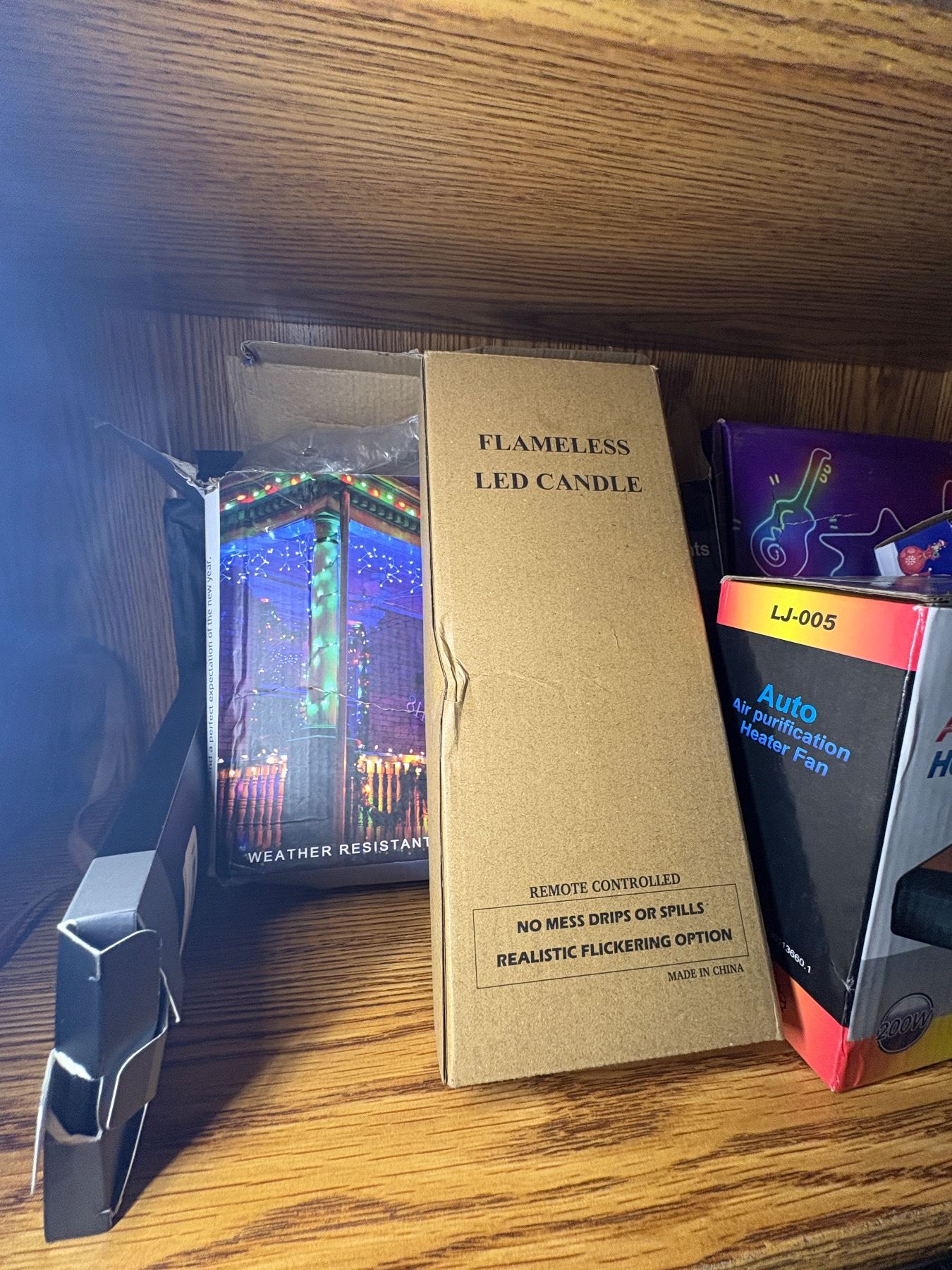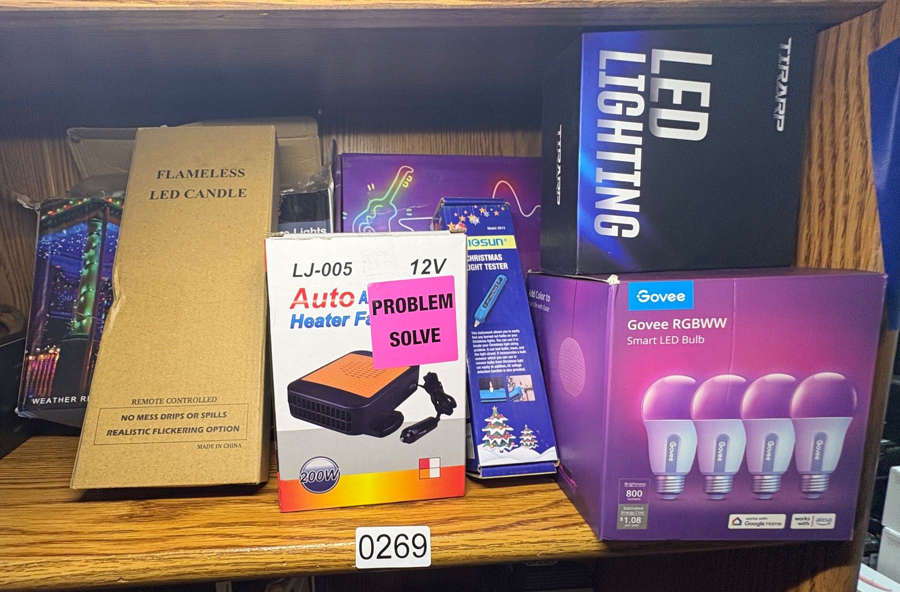 LARGE GROUP OF SOATED LIGHTS - FLAMENESS LED CANDELS / GOVEE RGB WW LED SMART BULB/ LED LIGHTS/ AUTO HEATER FANS, ETC