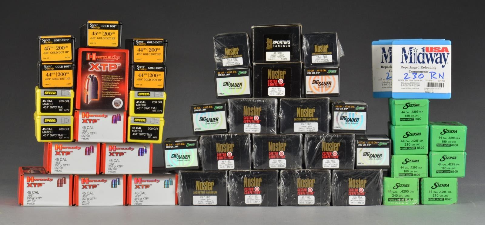 44, 41 CAL. Both factory boxes & bulk packaging. Very wide assortment of bullet styles. Lot includes: 45 CAL.: 1 case 1,000 rd. Montana Gold 45 cal. 200 gr. JFP / 2 boxes 1,000 rd. Magtech BU 45E 45 Auto JHP 185 gr. / 3 bags 100 rd. Magtech BU 45E Auto JHP 185 gr. / 10 boxes 250 rd. Nosler Custom Competition 45 cal. 185 gr. Hollow Point / 5 boxes 100 rd. Hornady XTP 45 cal. 250 gr. XTP / 1 case 2,300 rd. Montana Gold Bullet Inc. 45 cal. 200 gr. JFP / 2 boxes 100 rd. Speer Gold Dot 45 cal. 200 gr. HP / 2 boxes 100 rd. Midway 45 cal. 230 gr. / 1 case 500 rd. Western Nevada 45 cal. 230 gr. / 1 case 2,300 rd. Montana Gold 45 cal. 185 gr. JHP / 4 boxes 100 rd. Speer 45 cal. 200 gr. Match Grade SWC TMJ / 6 boxes 100 rd. Sig Sauer Sig V Crown 45 cal. 200 gr. Hollow Point. 44 CAL.: 3 boxes 100 rd. Speer Gold Dot 44 special 200 gr. / 1 box 100 rd. Sierra Sports Master 44 cal. 210 gr. JHC / 2 boxes 100 rd. Sierra 44 cal. 210 gr. JHC / 1 box 100 rd. Sierra 44 cal. 240 gr. JHC / 10 bags 50 rd. COP 44 mag. 200 gr. / 5 bags 100 rd. Magtech 44 Rem. mag. 240 gr. SJSP / 5 bags 100 rd. Winchester 44 cal. 210 gr. STHP / 4 boxes 50 rd. Speer Gold Dot 44 cal. 270 gr. GDSP / 4 boxes 100 rd. Sierra 44 cal. 180 gr. JHC / 1 box 250 rd. Nosler 44 cal. 200 gr. Hollow Point / 1 box 100 rd. Nosler 44 cal. 240 gr. Soft Point / 3 boxes 100 rd. Speer Gold Dot 44 spl. 200 gr. Gold Dot Hollow Point. 41 CAL.: 10 bags 100 rd. Remington 41 Mag. 200 gr. / CONDITION: most factory packaging is very good to nearly new. Bulk packaging may have staining, flexing & taped repairs. Boxes appear to be full but some are not factory sealed. PROVENANCE: From the Frederic W. Thrane Collection. (02-14149-1/RW). $800 - 1,200.