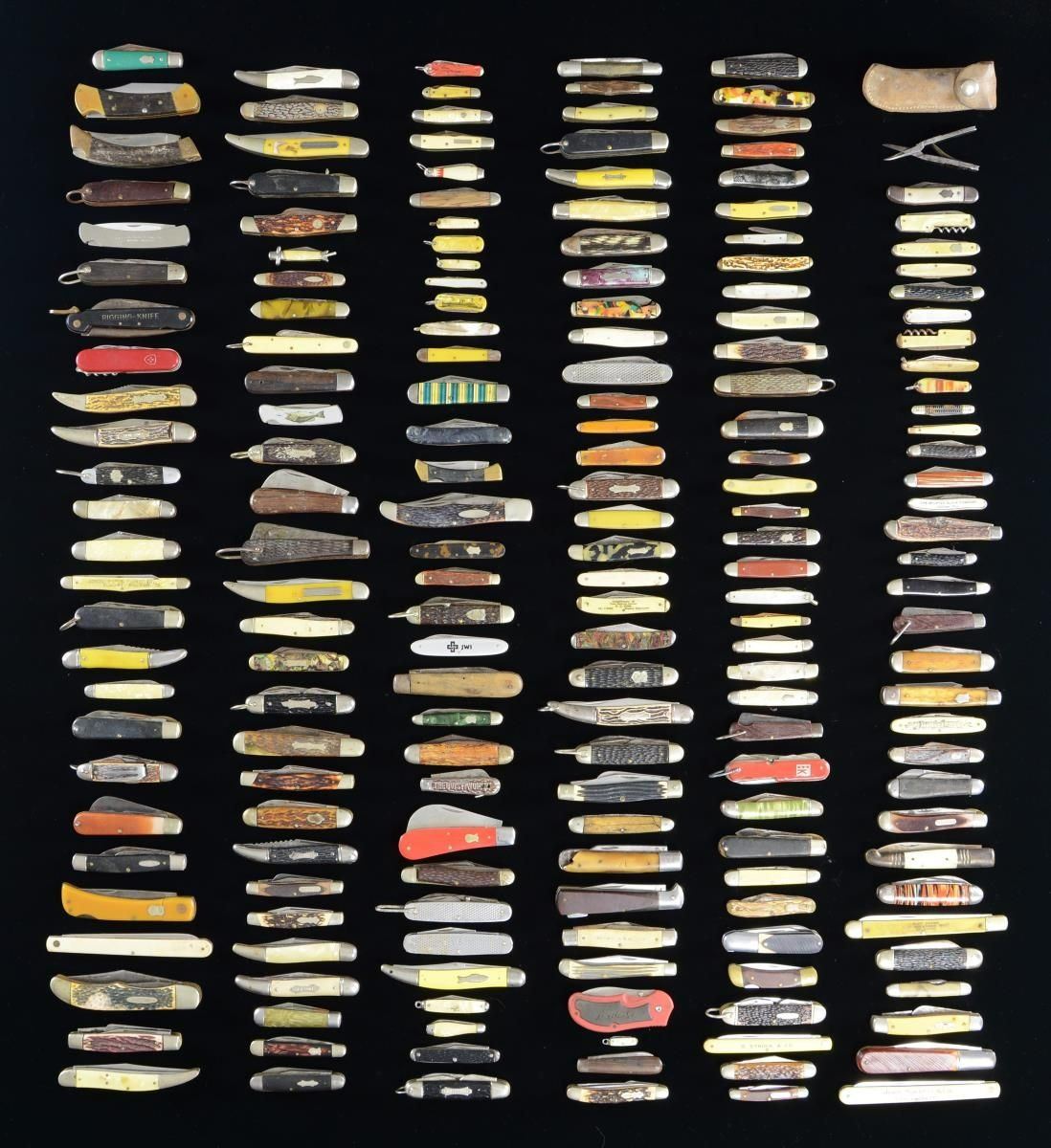 An exceptionally large grouping of many high quality pocket knives by a variety of different mfgs. Many well known name are represented in this superb laot including Boker, Remington, Kabar, Camillus, Western, Victorinox, Kutmaster, Browning, Buck and many many more. Knives range in size from small to large and feature an assortment of blade profiles and grip panel materials. A rare chance to greatly enhance the inventory of a dealer of fill out and advanced collection. CONDITION: good, with knives exhibiting varying degrees of wear from storage, handling, and use. Some knives exhibit mild to moderate oxidation, but remain otherwise appear to remain sturdy and serviceable. (02-21053/MLW/BF). $1,000-1,500.