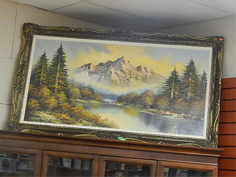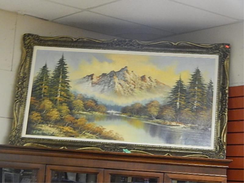 LARGE GUILDED FRAMED ORIGINAL OIL ON CANVASS - LAKE & MOUNTIANS - SIGNED